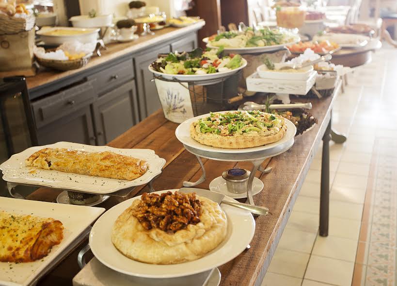 Panquequinhas americanas, Mel, geleias e manteiga, Crepioca de creme de espinafre com tomatinhos, Tapioca feita na hora, Banana assada com ricota canela e castanhas, Queijo mineiro grelhado com tomate assado, Variedade de pães (pão de queijo, francês, baguete, broa e pão de batata), Iogurte batido com mel orgânico, com frutas vermelhas, Salada de fruta, Frutas fatiadas, Bolo de laranja e Bolo de cenoura com ganache de chocolate.Na mesa de pratos quentes entram: Arroz de bacalhau com brócolis, damascos e amêndoas, Brie em crout, Copinhos de trigo frick com coalhada, Quiche de alho porró, Pernil com abacaxi