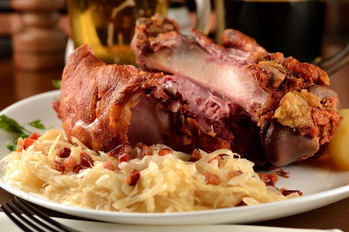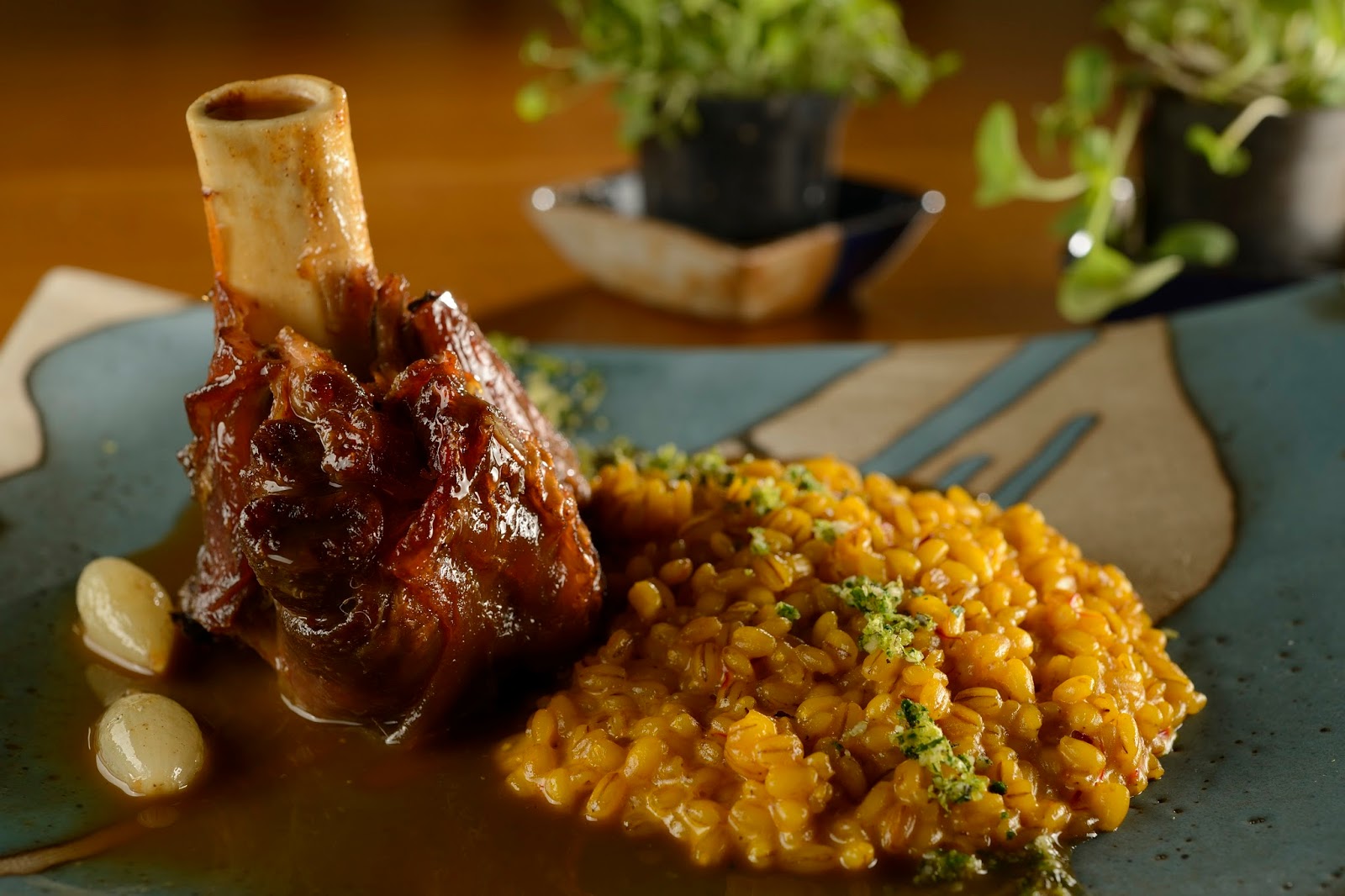 Stinco de cordeiro ao molho de ervas com risoto zafferano
