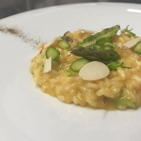 Risotto cacio, pepe, pere e fave (Arroz carnaroli, queijo pecorino e pimenta-do-reino, creme de pêra e fava fresca)