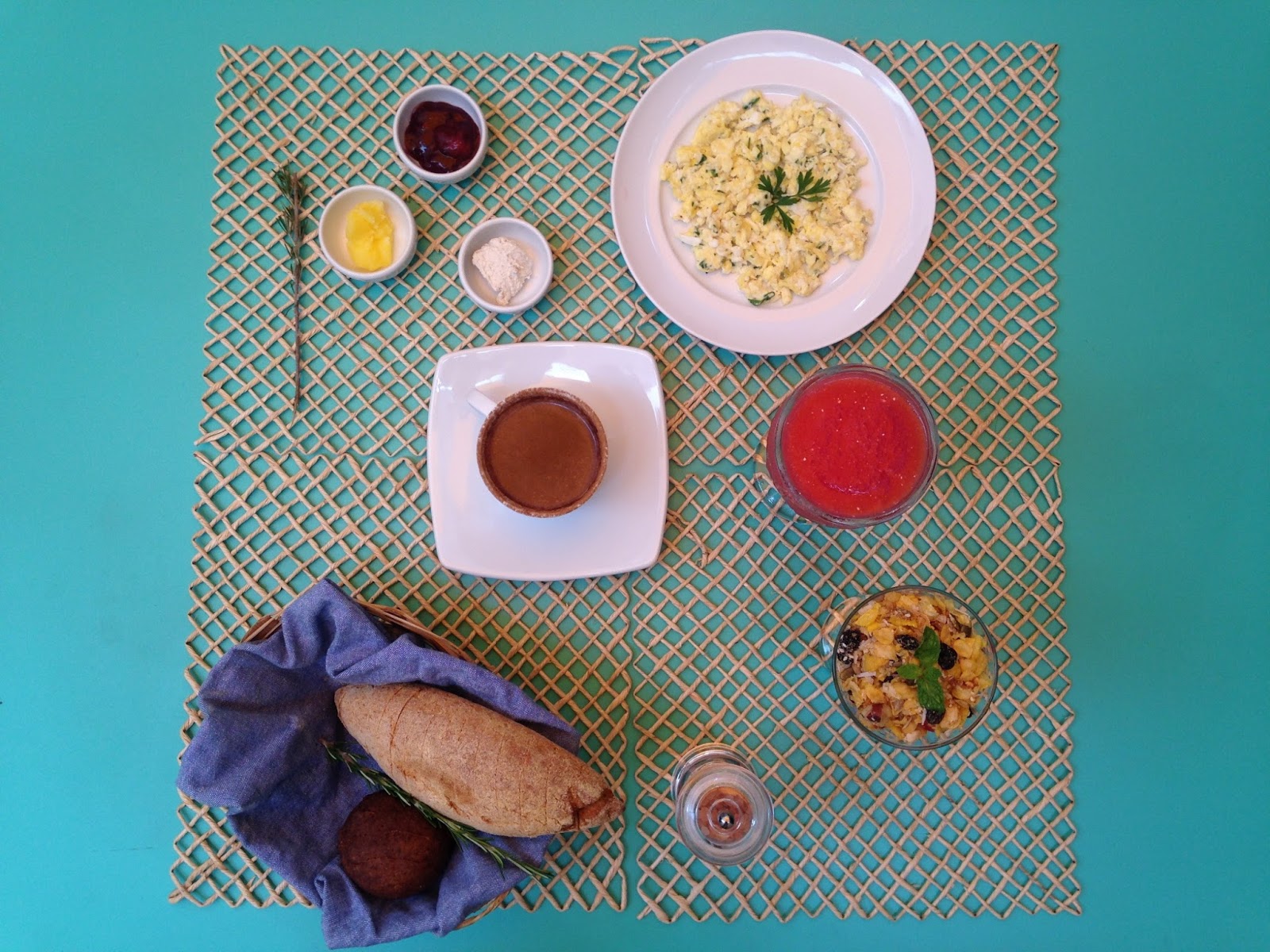 A chef monta uma bela mesa com opções de café da manhã, como: Omeletinhos com tomate, queijo mineiro, cebolas carameladas e azeite trufado, Croque Monsieur, Frios (Parma, peito de peru e presunto), Queijos (búfala, queijo mineiro, muçarela e ricota com azeite de ervas), Panquequinhas americanas, Mel, geleias e manteiga, Crepioca de creme de espinafre com tomatinhos, Tapioca feita na hora, Banana assada com ricota canela e castanhas, Queijo mineiro grelhado com tomate assado, Variedade de pães (pão de queijo, francês, baguete, broa e pão de batata),Iogurte batido com mel orgânico, com frutas vermelhas, Salada de fruta, Frutas fatiadas, Bolo de laranja e Bolo de cenoura com ganache de chocolate.