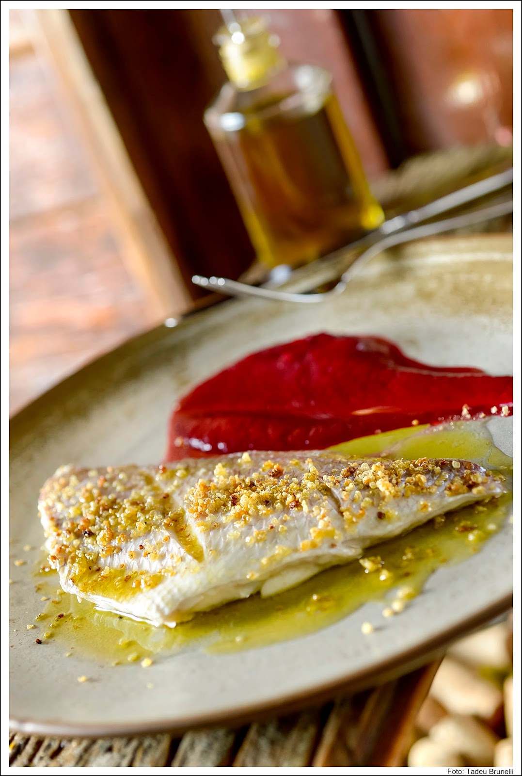 Pesca do dia ao vapor com quinoa crocante e purê de beterraba