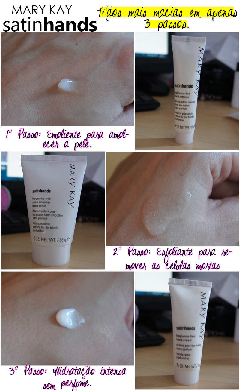 Hoje mais cedo, no post da GlossyBox, falei que o Satin Hands da Mary Kay iria ganhar um post só dele e aqui está!! Como eu disse, esse produto não poderia ter chegado em melhor hora, fiquei quase um mês na Europa enfrentando temperaturas baixíssimas e o ar seco e o reflexo disso nas minhas mãos não poderia ter ficado mais evidente, minha mão estava muito áspera e a cutícula em volta dos dedos estava toda esbranquiçada e rachando. Isso sem falar que a minha mão já é bem seca normalmente, nesse caso então ficou pior do que muitos pés por aí, para vocês terem uma ideia. Então, quando vi na GlossyBox um kit que prometia renovar a pele das mãos e deixa-la macia experimentei na hora. A aplicação é bem fácil e é feita em 3 etapas que vocês conferem abaixo: