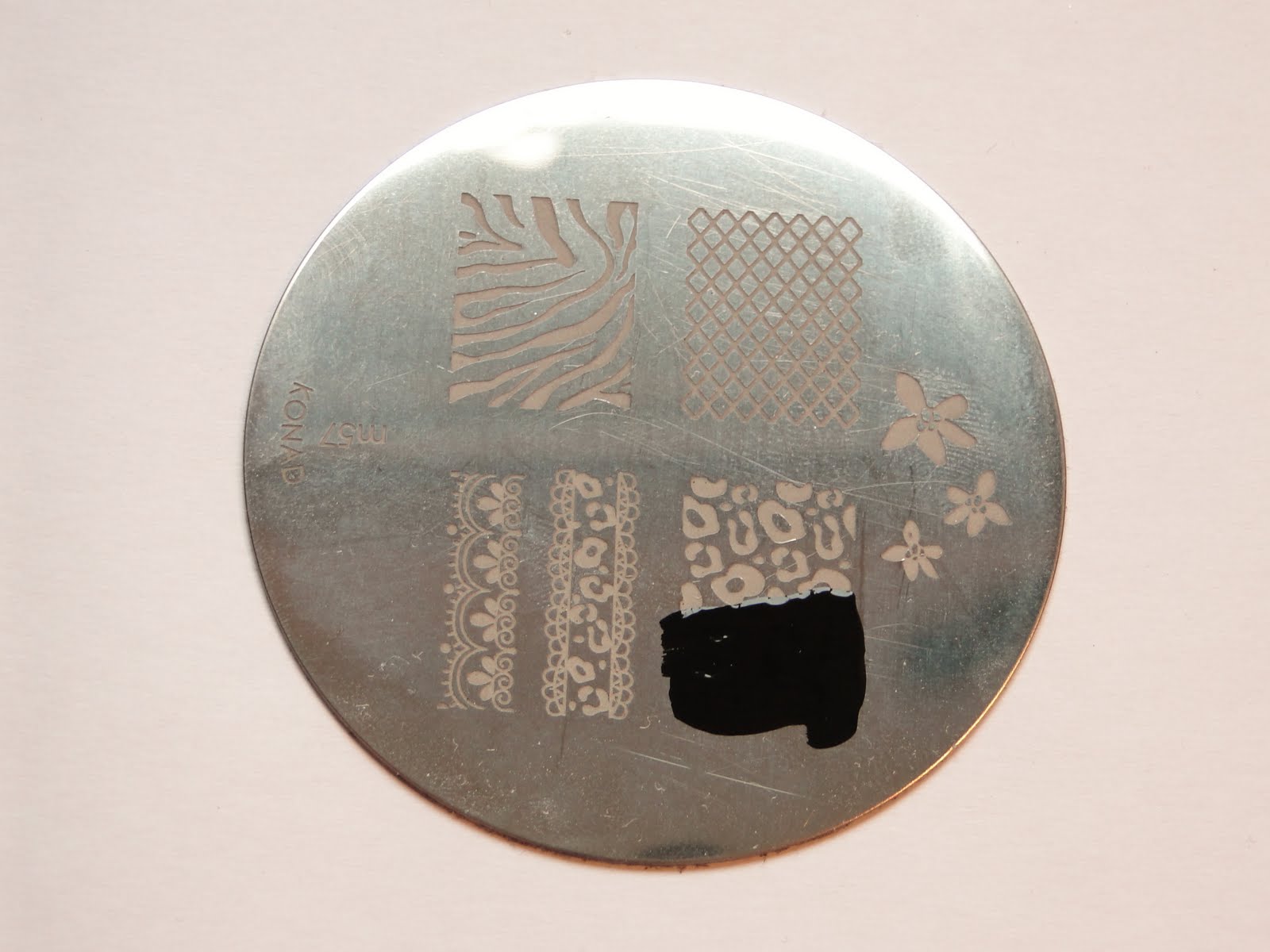 | Material necessário: plaquinha Konad, raspadeira, carimbo e esmalte especial Konad. |