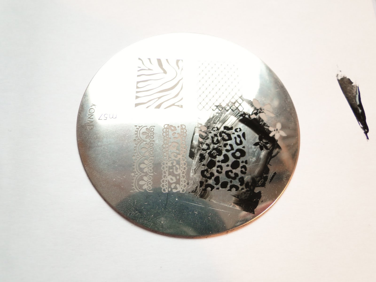 | Pra começar é só passar um pequena quantidade do esmalte no começo da estampa. Esse esmalte é muito pigmentado e faz uma bela sujeira, então é bom colocar só o necessário. |