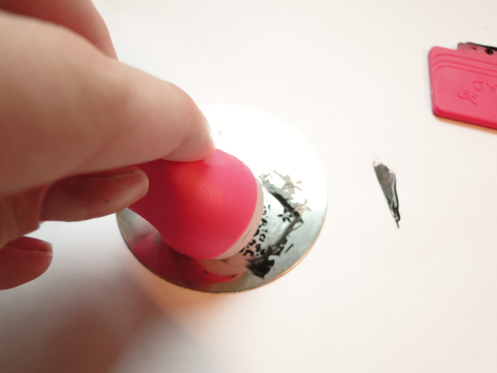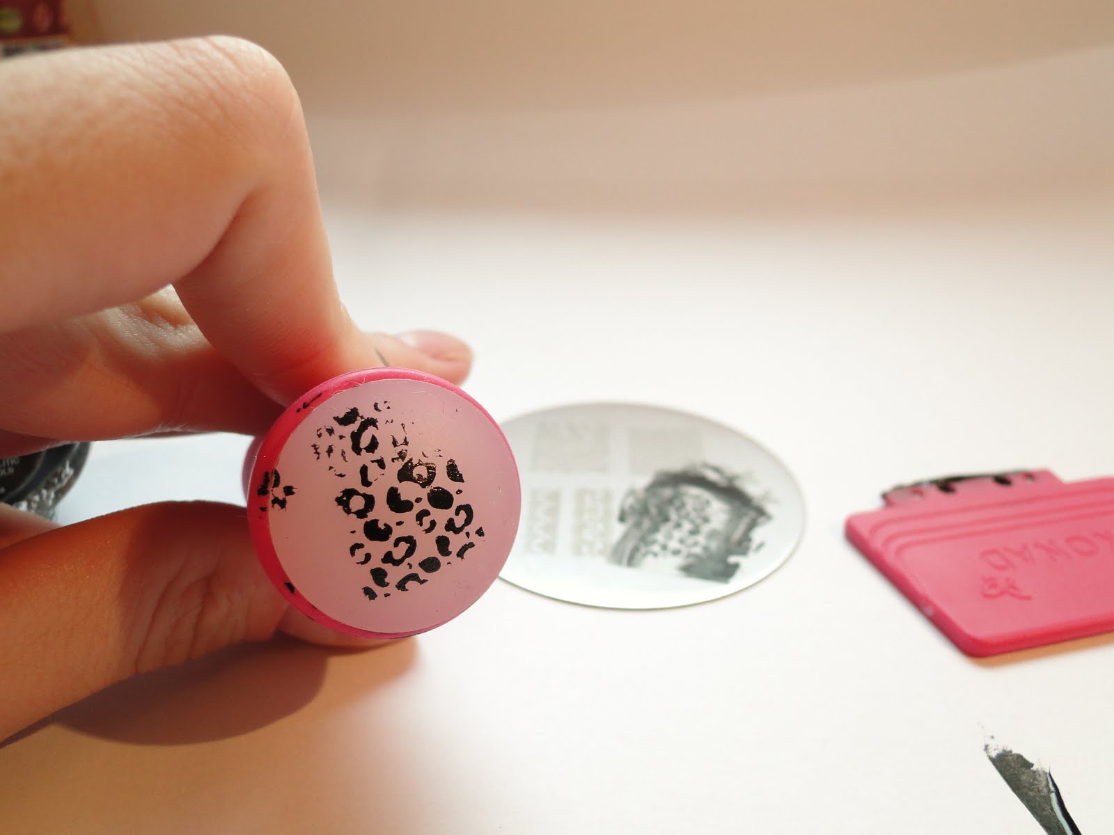 Pra começar é só passar um pequena quantidade do esmalte no começo da estampa. Esse esmalte é muito pigmentado e faz uma bela sujeira, então é bom colocar só o necessário.