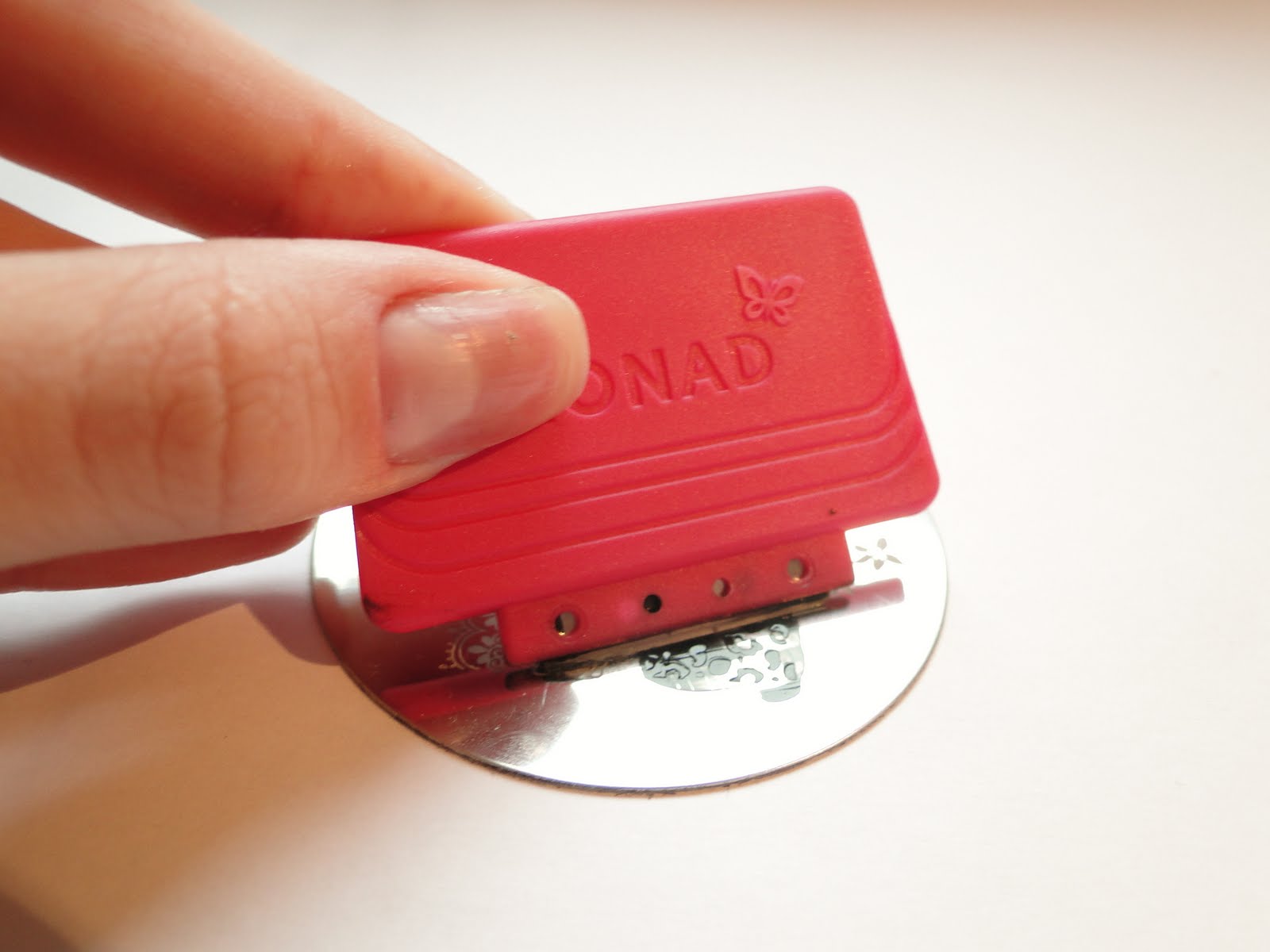 Ai é só passar a raspadeira em cima pra espalhar o esmalte por toda a estampa.