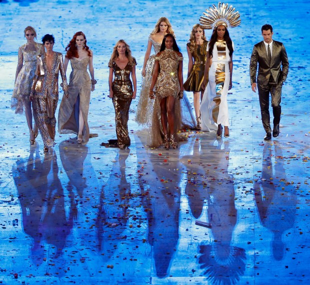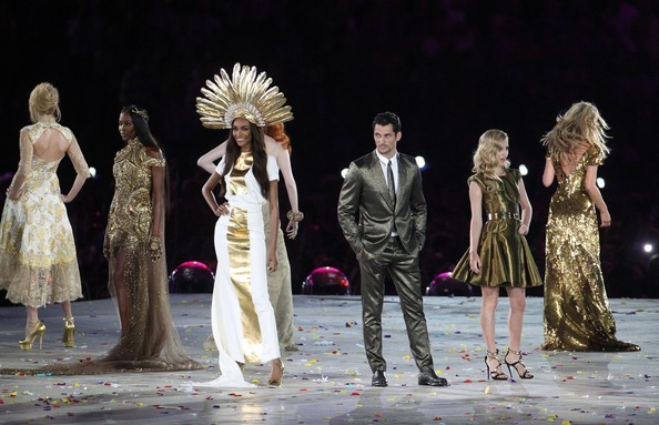 Bom, não se fala em outra coisa hoje a não ser o show que Londres deu no encerramento dos seus Jogos Olímpicos, que alem de celebrar o povo e a cidade, celebrou principalmente a música e a moda do pais. O momento fashion da noite ocorreu após George Michael entrar no palco para cantar seu hit Freedon, conhecido por ter o clipe repleto de supermodels, mas foi só quando ele saiu de cena que diversos caminhões entraram no enorme cenário trazendo imagens das maiores tops britânicas, fotografadas para Vogue Inglesa por Mark Night. Caminhões devidamente posicionados, os painéis de fotos caíram e as modelos foram reveladas, todas em looks dourados, criados por estilistas ingleses.