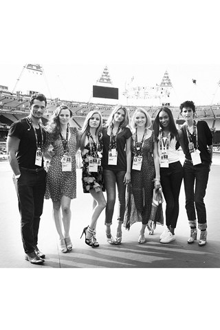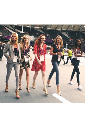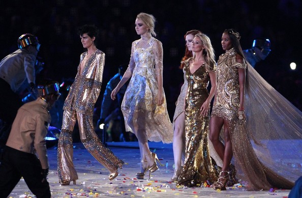 Kate Moss e Naomi Campbell, sem dúvidas, as estrelas do show, entraram de Alexander McQueen, Stella Tennant vestiu o terno dourado criado por Christopher Kane, Georgia May Jagger usou Victoria Beckham, Lily Donaldson deVivianne Westwood, Lily Cole de Erdem, Jourdan Dunn de Jonathan Saunders, Karen Elson de Burberry e não podemos esquecer do único representante masculino, David Gandy de Paul Smith.