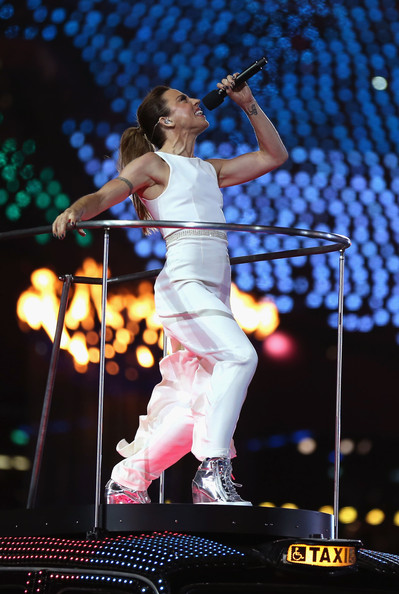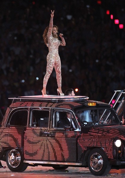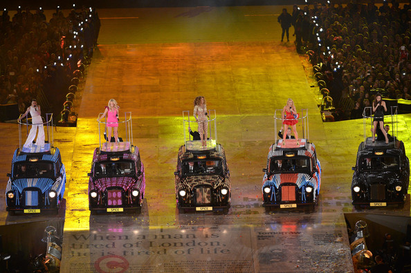 Alem das modelos, as cantoras também representaram a moda inglesa, começando pelas Spice Girls, que se reuniram pela primeira vez desde 2008 e trouxeram versões atualizadas de seus alteregos, representados nas roupas e nos black cabs em que se apresentaram. Victoria Beckham escolheu um mullet dress de Giles Deacon que ficou lindíssimo, conforme o taxi se movimentada, sua calda voava com o vento, já Geri, a Ginger Spice, escolheu uma releitura do seu famosíssimo vestido Union Jack, dessa vez o modelo, criado por Suzanne Neville era curtíssimo, vermelho e trazia um babado formado pela bandeira na parte de trás. Emma Bunton, a Baby Spice, escolheu seu característico rosa, dessa vez em versão mais quente,não tão bebê, para mini de ombros acentuados, criado por Maggie Cooke. Mel C, a Sporty Spice, optou por um macacão branco, customizado pela tradicional marca esportiva JD Sports e manteve o look esportista com o tênis prateado com plataforma embutida e para finalizar a Scary Spice, Mel B deixou o animal print de lado para usar um macacão todo bordado criado por Zuhair Murad.