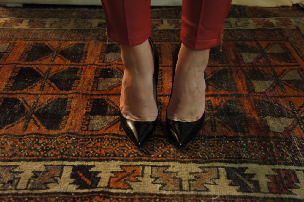 Sábado passado eu tive o aniversário de uma amiga para ir e eu aproveitei parar tirar duas peças que eu tava querendo usar há algum tempo do armário, a calça vermelha de couro da Zara que vocês já tinham visto aqui e a blusa com peplum preta da H&M, arrematei com o cinto deuso de placa de metal e spikes da Chez Bijoux e nos pés meus amados Louboutins! E aí, curtiram a produção?? Eu amei!