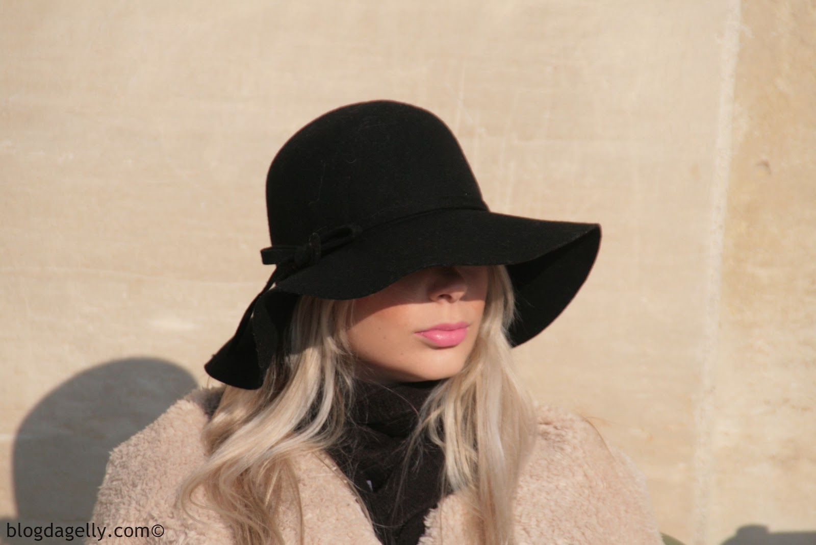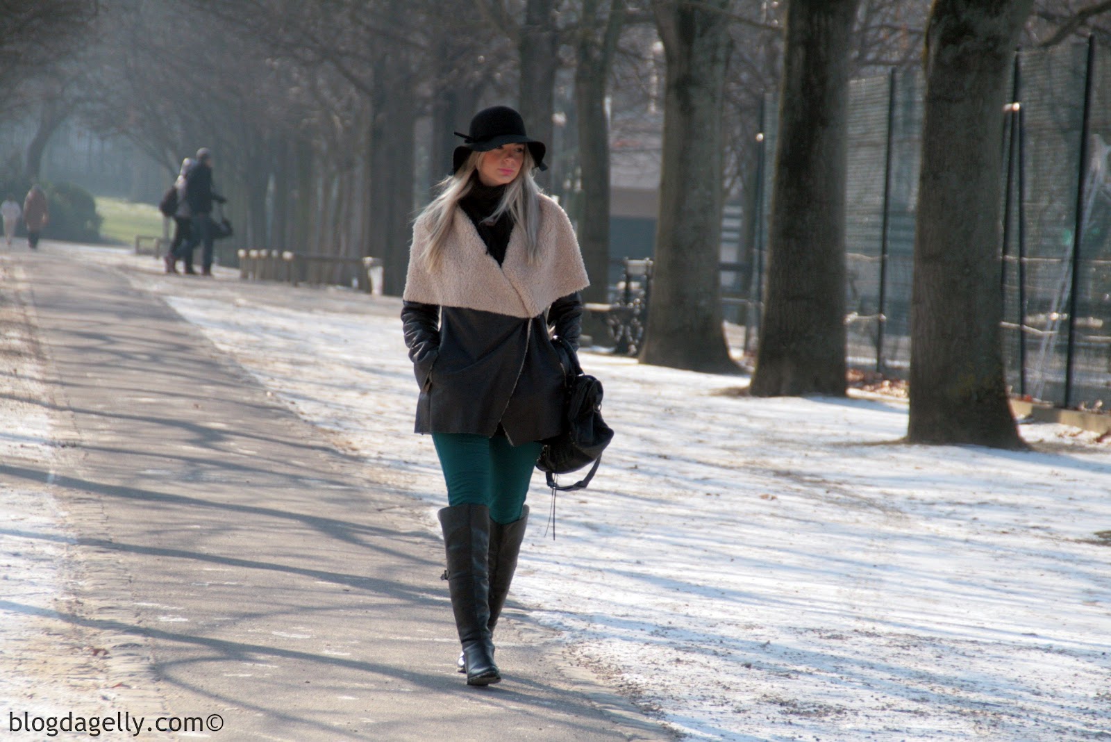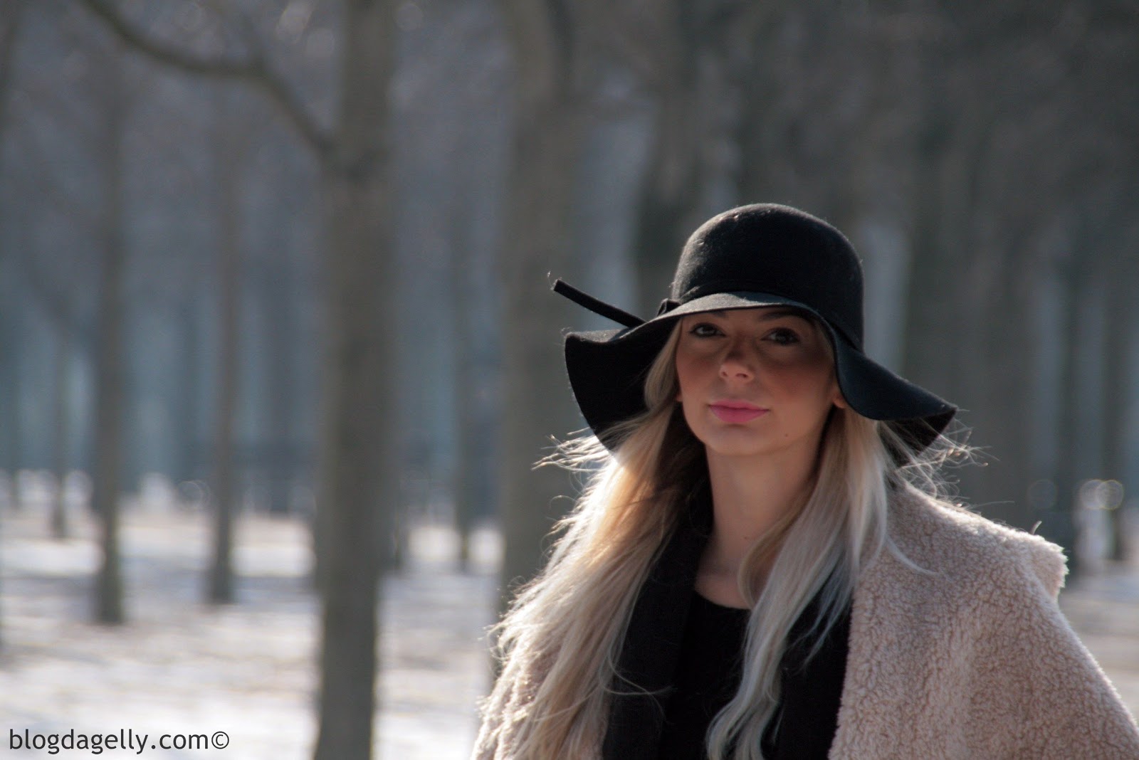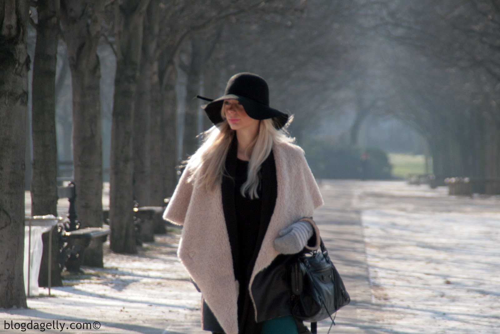 O look de hoje é o último em Paris, mas também é o mais bonito e não é pela roupa, mas sim pela locação, o maravilhoso Jardim de Luxemburgo. O dia estava lindo, mas enganava, pois o frio continuava fortíssimo, dei sorte de escolher esse casaco que eu ainda não havia usado e descobri que ele era bem quente. Para combinar com ele escolhi uma calça verde, para dar um pouco de cor, uma malha preta bem grossa, as botas cuissard e o floppy hat.