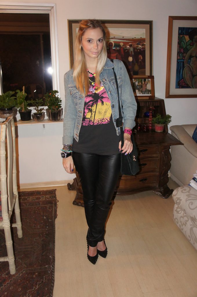 Depois de muito tempo feio, o sol resolveu aparecer aqui em São Paulo e como eu já estava cansada de looks invernais, usei uma produção bem colorida, a cara do verão!! Apostei com tudo nos tons neon e combinei a camiseta estampada da H&M, que tem carinha vintage e eu adoro, com calça de couro e jaqueta jeans, pois mesmo com sol estava aquele ventinho. Como ia em um barzinho preferi usar um salto, no caso o scarpin de spike da Santa Lolla e para finalizar investi em mais acessórios bem coloridos, como o o maxicolar da ChezBijoux.com.br. E aí, o que vocês acharam??