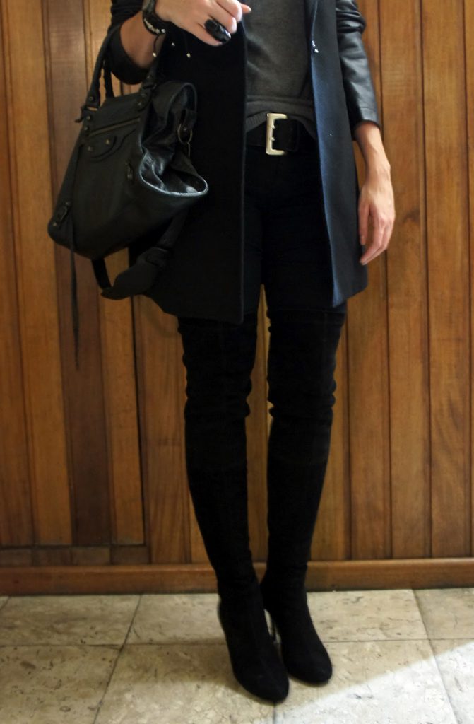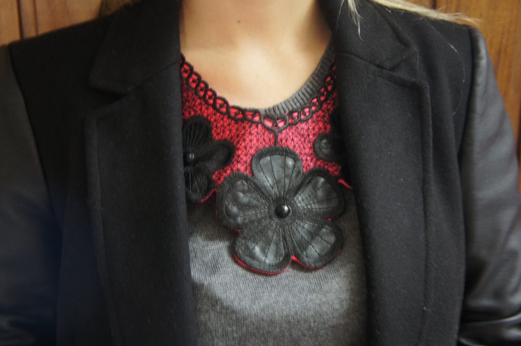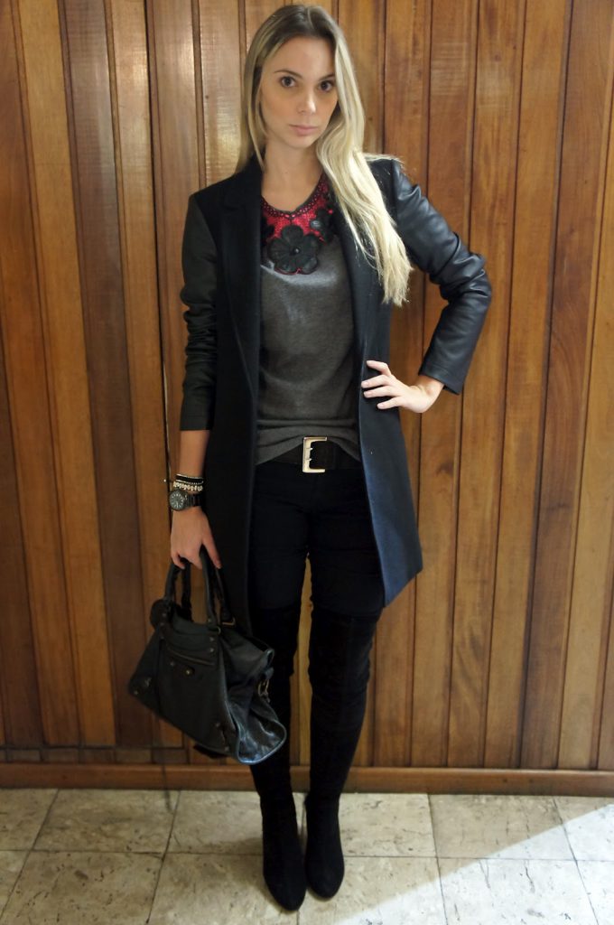 E hoje tem mais um look do fim de semana, bem básico que usei para ir jantar. Como tava friozinho usei a malha cinza e o sobretudo com manga de couro da Stradivarius, para dar um toque de cor e uma graça no look usei da gola pink neon da Chez Bijoux e no pés usei novamente a minha bota de cano alto.
