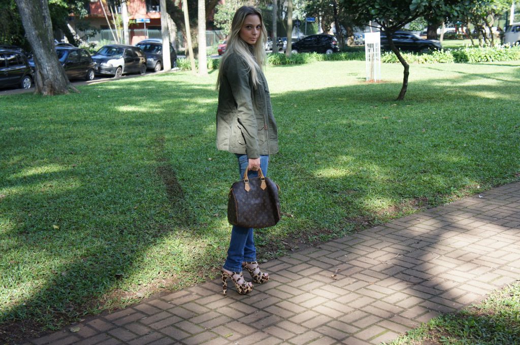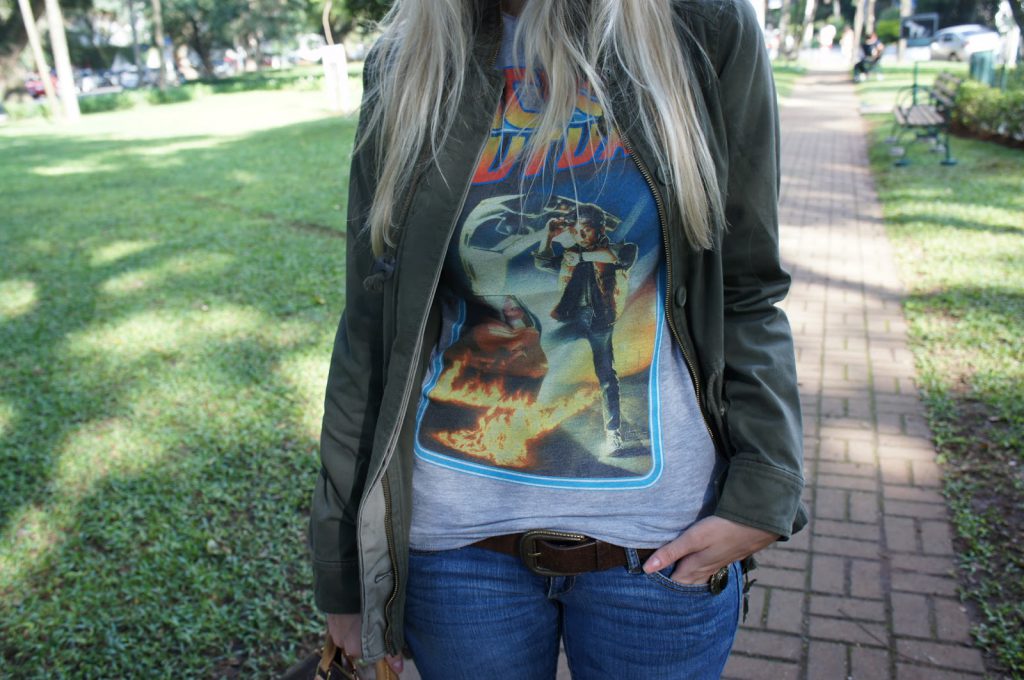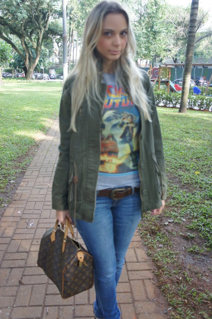 Tenho mania de encanar em certas combinações que acabo usando sempre e atualmente estou numa fase oncinha + verde militar! Vocês já viram essa combinação aqui, mas acho ela super versátil e repito mesmo, rs. Acho legal, pois ela pode ser usada em diferentes ocasiões e com diferentes elementos e combinações. Dessa vez combinei a sandália de oncinha com a parka da Zara, criei um look bem casual com calça jeans e essa t-shirt fofa do filme “De Volta Para o Futuro” para ir almoçar no fim de semana. E aí, o que vocês acharam?