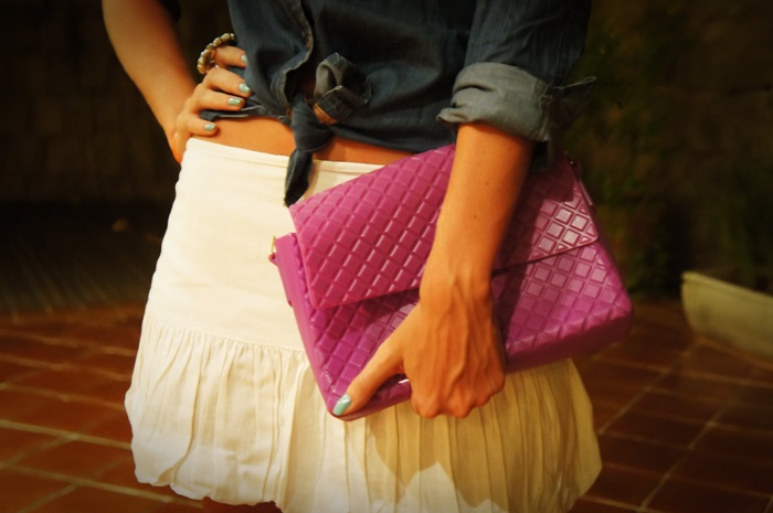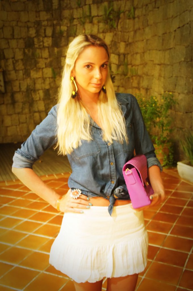 Bom dia gente, e aí, como foi o feriado de vocês?? O meu foi bem tranquilo, dia de descansar bastante, curtir a cama e curar um restinho de gripe que insiste em me perseguir! Bom, mas vamos ao que interessa, hoje tenho mais um look da minha viagem pra Ilhabela pra vocês, ta rendendo essa viagem, né! Usei essa produção para ir jantar e achei perfeita para a ocasião, combinei a saia branca da coleção da Daslu para Riachuelo com a camisa jeans e completei com uns acessórios bem coloridos e alegres, como o maxianel da H&M, o brinco lindo da Chez Bijoux e a essa bolsa de praia de plástico, que eu já tinha mostrado pra vocês. Achei o resultado final bem fofo, pena que as fotos não ficaram muito boas! 🙁