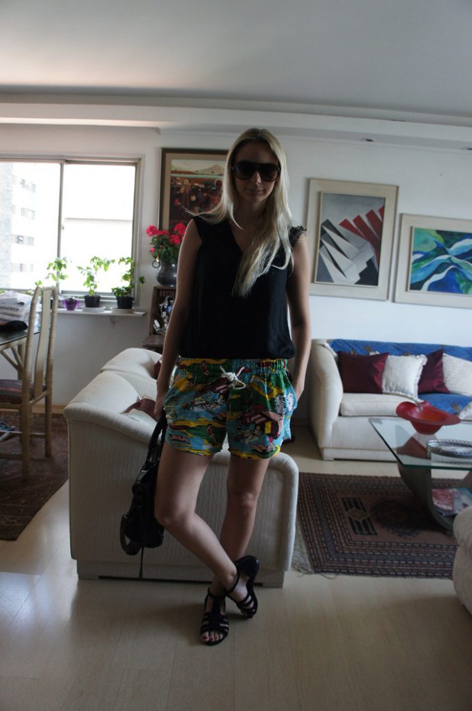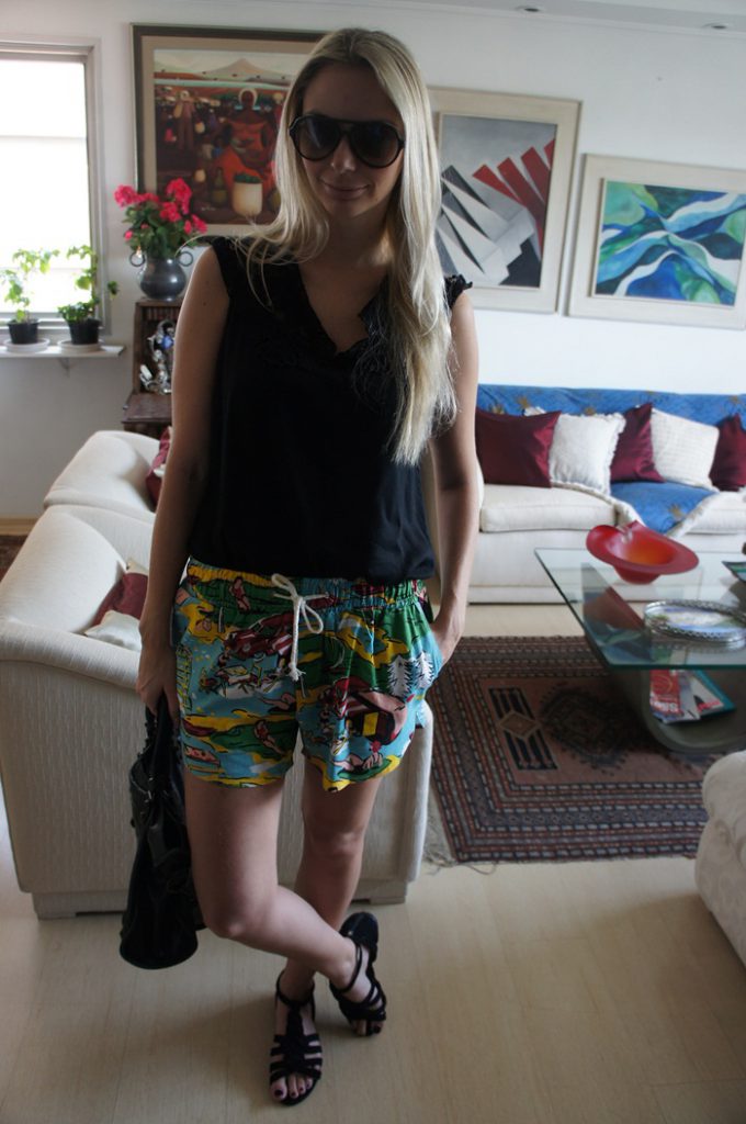 O blog anda meio desfalcado de looks, né? Peço desculpas à vocês, é que com esse calor que tem feito aqui em São Paulo ta difícil produzir algo legal e sair bem na foto, rs! Mas hoje eu vou mostrar o último look que eu consegui fotografar, usando o shorts calção da coleção da Daslu para Riachuelo, ele é bem fresquinho, usei para ir almoçar no clube, então é uma roupa bem descontraída, ficaria ótima também na praia ou para os fins de semana infernais de quente aqui na cidade. Combinei o shorts com uma blusa preta com detalhe de renda na gola, para balancear a casualidade de shorts, nos pés coloquei a rasteirinha preta de sempre e foi só, pois tenho muita dificuldade de usar bijoux quanto está muito quente! Post meio desabafo esse, né!? Mas e vocês também sofrem com o calor na hora de se vestir??