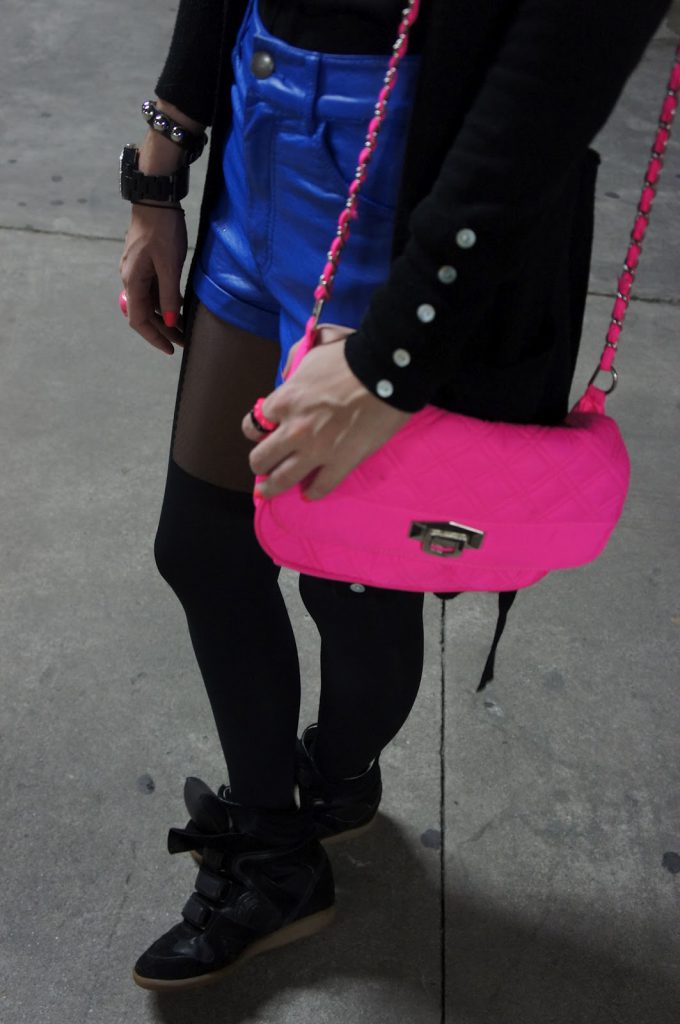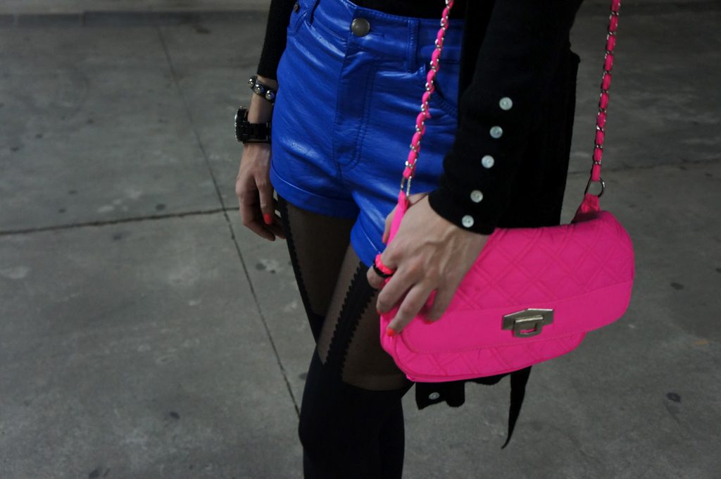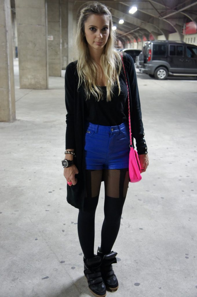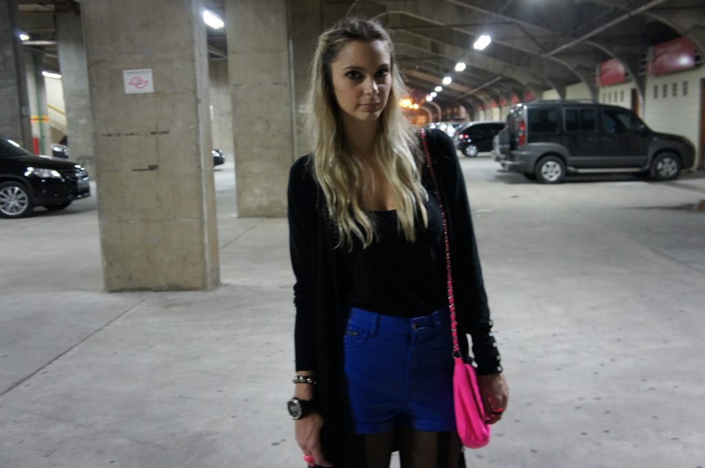 Esse fim de semana rolou mais um festival aqui em São Paulo, o Sonar, então tenho para vocês mais dois looks que podem servir de inspiração para show e afins! Ta bem frio por aqui esses dias, mas mesmo assim não abandonei meus amados shortinhos e aproveitei para usar com meia calça. No primeiro dia escolhi o modelo de couro azul e cintura alta da H&M que eu tinha comprado a tempos, mas não tinha ideia de como nem onde usar. Como o shorts já é bem diferente (pelo menos para o meu estilo) e chama bastante atenção por si só optei pelo bom e velho preto na regata básica e no cardigã e deu um toque diferente a produção com essa meia calça que imita cinta-liga da Topshop. Nos pés usei o sneaker companheiro de sempre e nos acessórios abusei do pink, cor que eu adoro ao lado do tom de azul do shorts. Só não reparem na cara de cansada, pois esqueci de fotografar o look antes de ir e só fui tirar as fotos as 5 da manhã!! rs