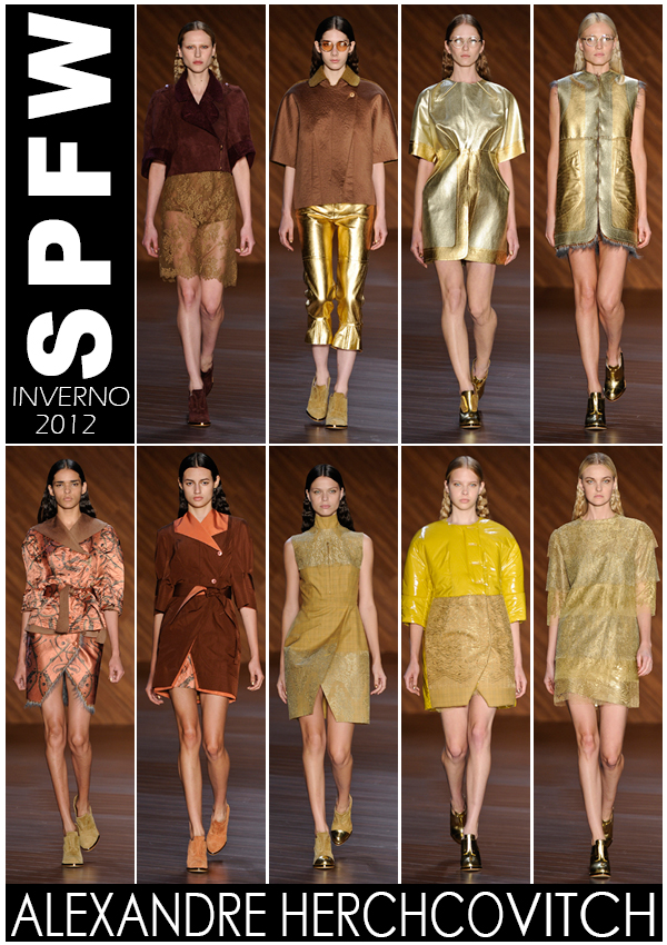 Alexandre Herchcovitch experimentou coisas novas para o inverno 2012. Começando cartela de cores formada por bege, camelo, oliva, marrom, laranja desbotado, pêssego, mostarda e ouro, que o próprio estilista comentou nunca ter usado antes. O estilo meio street e grunge, comum ao estilista, também ficou de lado e deu lugar a uma moda para uma mulher madura e elegante. O formato casulo dominou a modelagem e apareceu em casacos e vestidos, mas o resultado não ficou rígido, Alexandre conseguiu dar suavidade a forma, com o uso de materiais delicados como rendas e cetim de seda.