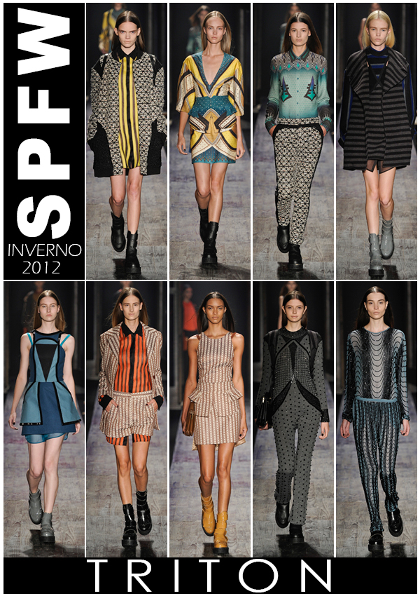 A estamparia foi o forte do desfile do inverno 2012 da Triton. Segundo Karen Fuke, estilista da marca, as referencias vieram de diversos lugares, inclusive da Catedral de Notre Dame, em Paris. Os motivos coloriram camisas, vestidos, casacos estruturados e até conjuntinhos estilo pijamas. No fim do desfile, uma série de peças mais trabalhadas foi exibida; canutilhos e missangas preencheram mangas, golas e punhos de peças feitas de lã, crepe, tweed, georgete de seda e organza.