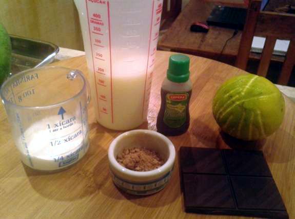 Ferva o leite junto com as raspas de laranja em uma panela. Fora do fogo despeje o leite ainda