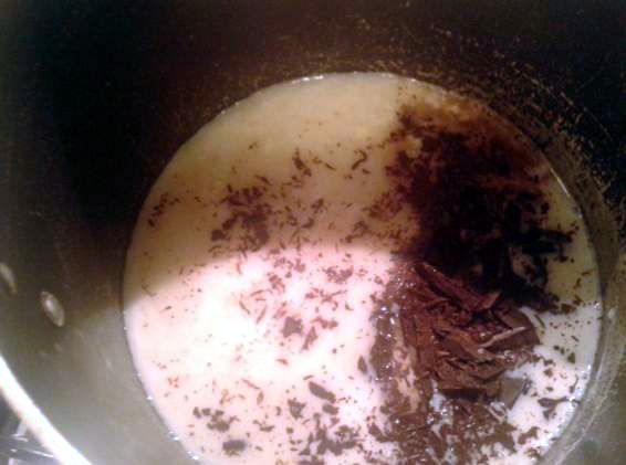 quente sobre o recipiente do chocolate picado, mexa bem até dissolver todo o chocolate. Adicione algumas gotinhas da essência baunilha e misture bem.