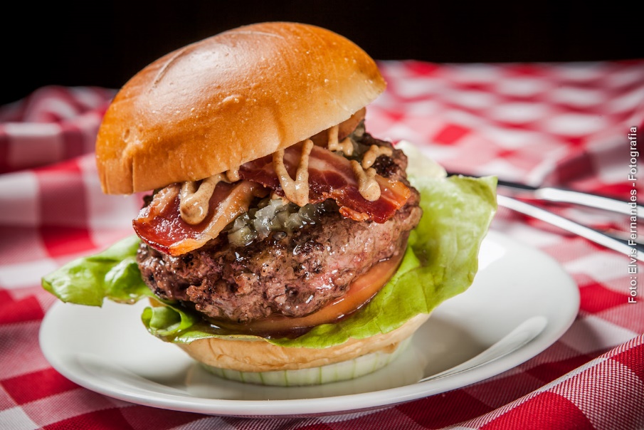 LINCOLN BURGER (Burger de fraldinha com Bacon, Relish de Pepino, Mostarda escura, Alface e Tomate)