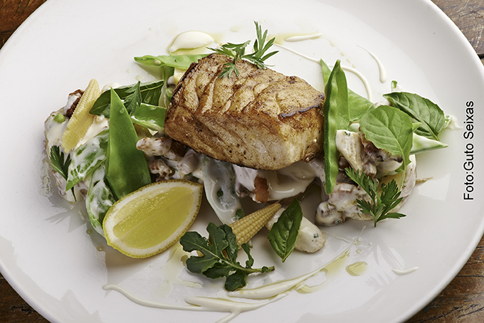 Peixe branco com salada de batatas com iogurte, ervilha torta, bacon, milheto e ervas ou