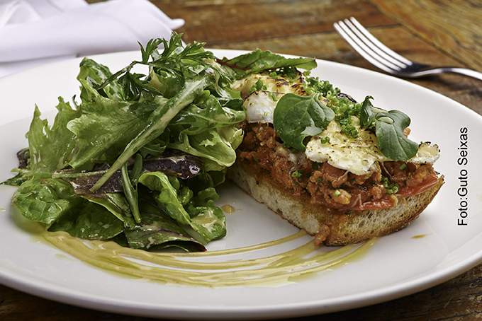 Brusqueta com ragu de linguiça, ricota, azeitonas, parmesão e salada verde com vinagrete de mostarda