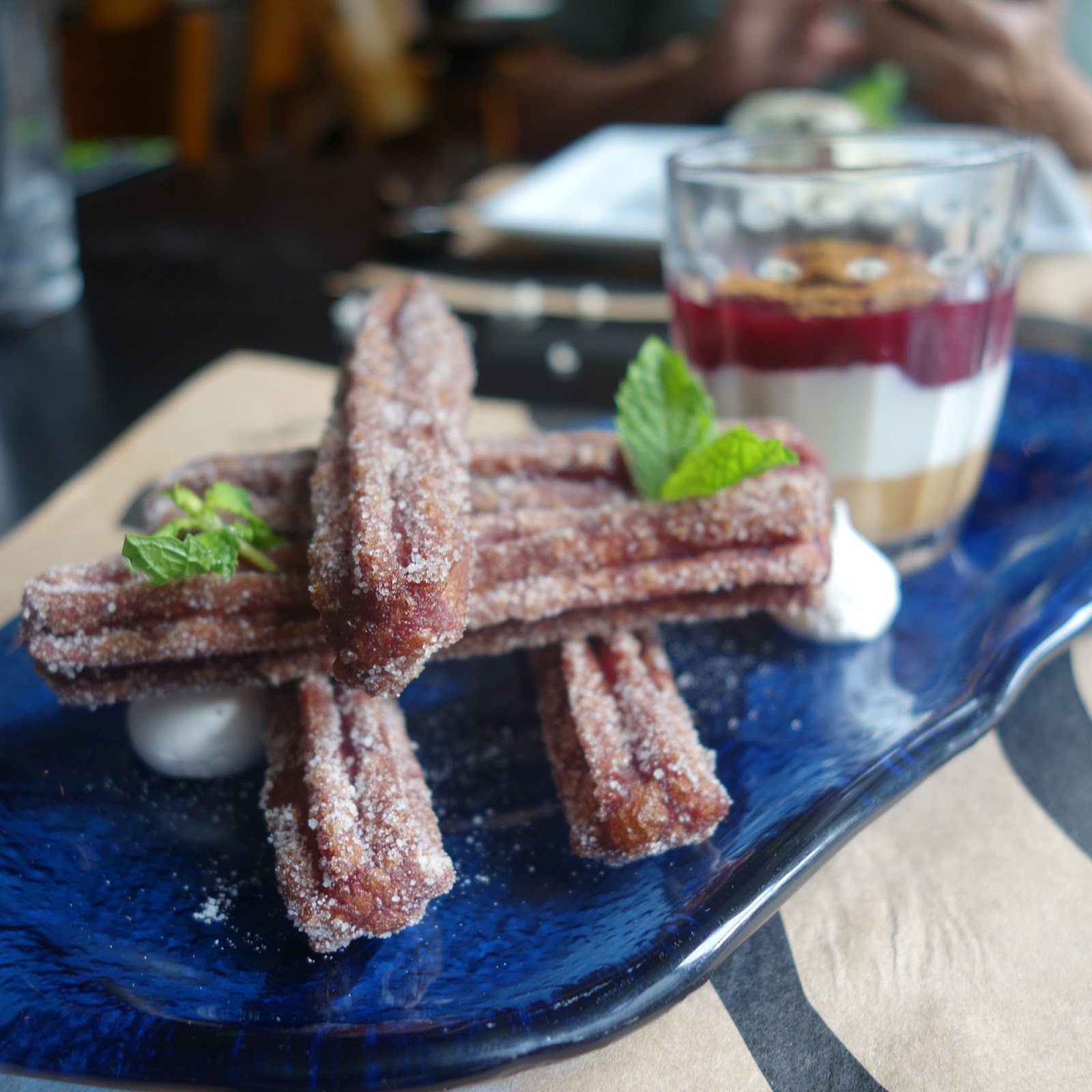 Como sobremesa tive que pedir os Churros Morados, um churro feito com aquele milho roxo tradicional do Peru. Ele é servido com doce de leite, crema de tres leches e mazamorra morada (geleia de chica morada).