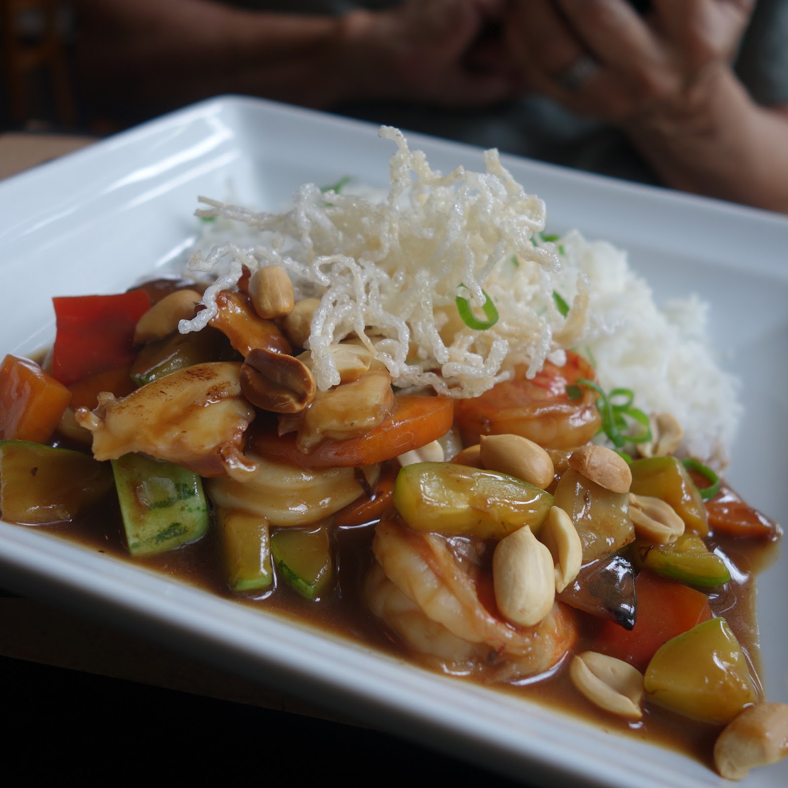 O prato, que mostra a forte influencia oriental na culinária peruana, vem com camarões e lulas salteados com legumes e acompanhados por arroz branco.