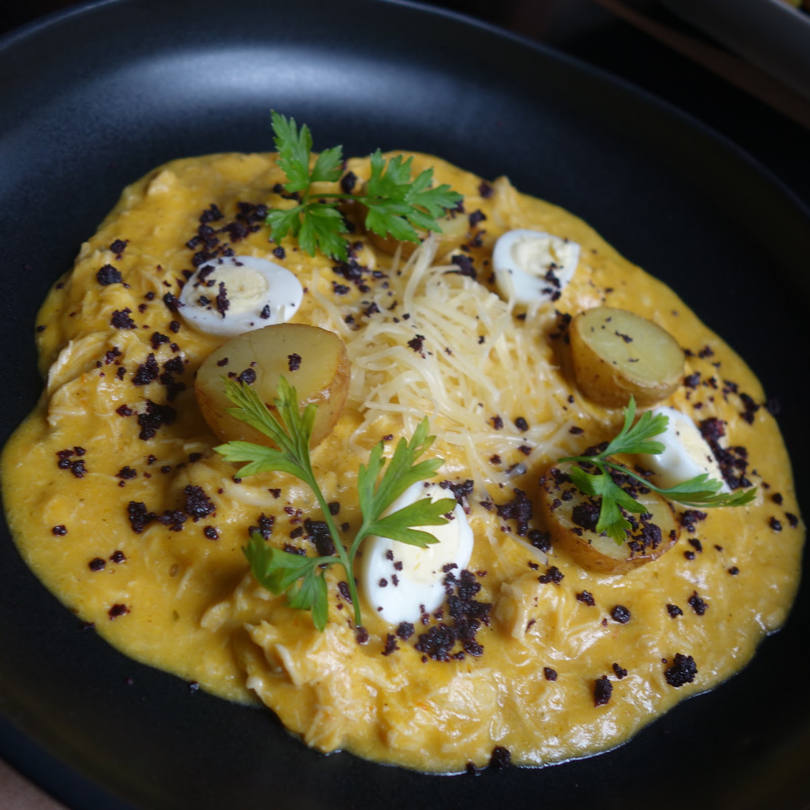 Eu escolhi um prato bem tradicional, o lindo ají de gallina! Ele vem com peito de frango desfiado num molho amarelo feito com pimentões peruanos, parmesão, ovo de codorna e uma deliciosa batatinha. Estava maravilhoso!