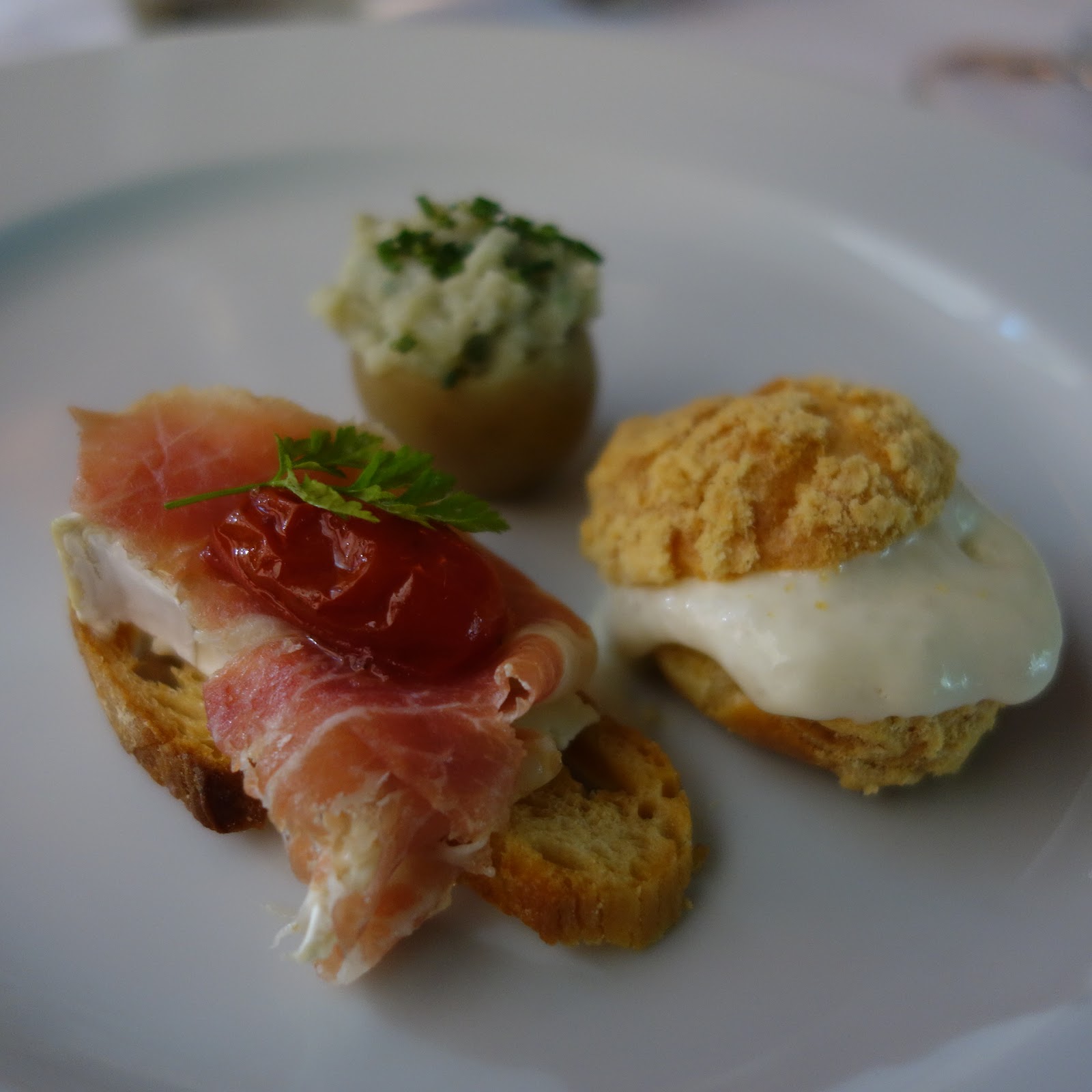 A primeira foi o canapé de Brillat-Savarin, presunto cru e tomate confitado, uma receita de fácil preparo que combina o agridoce dos tomates ao salgado do presunto cru e o queijo de triplo creme.