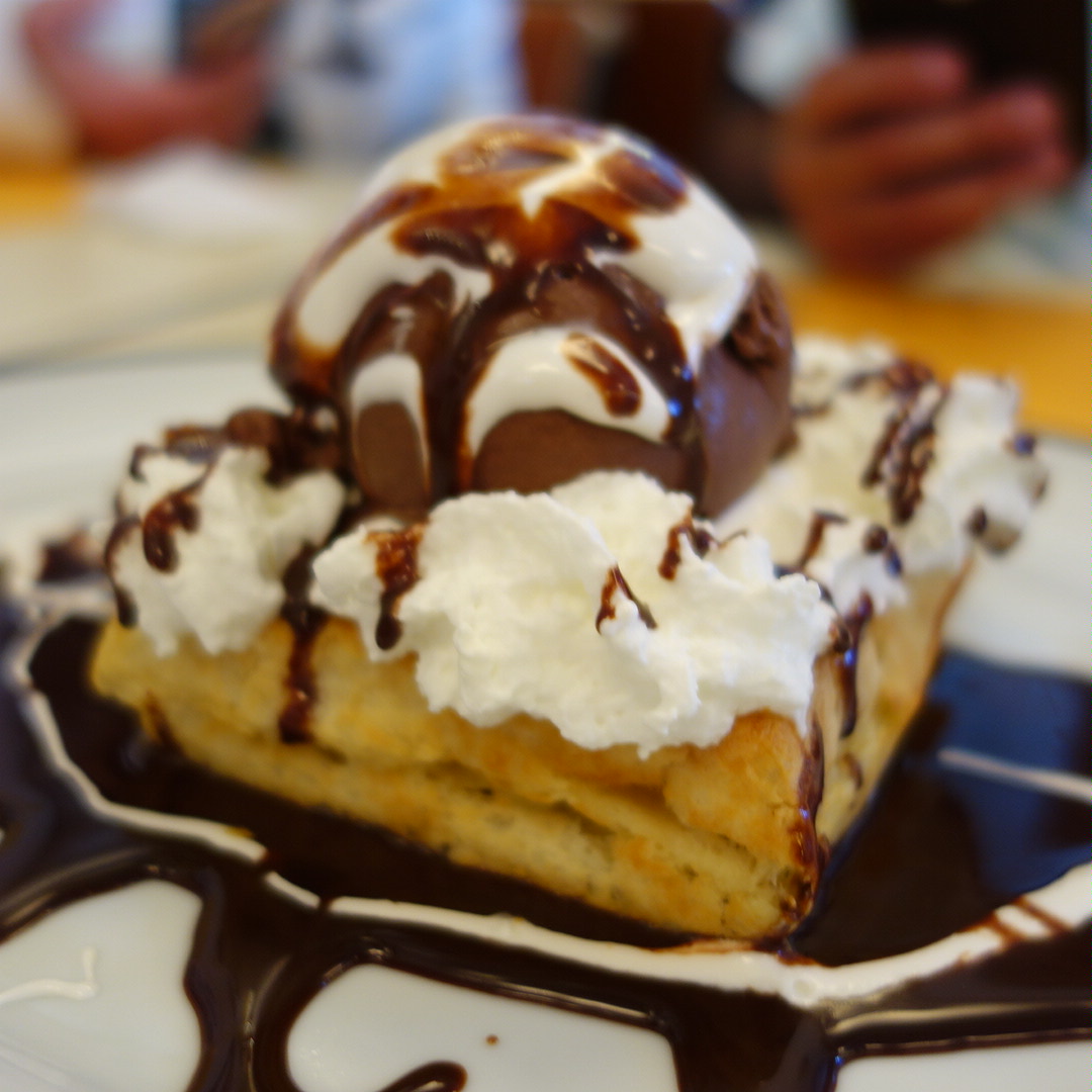 Na hora da sobremesa a grande novidade é o Waffle (R$ 24), servido crocante e quentinho com uma bola de sorvete de chocolate e coberto por grandes quantidades de calda de chocolate, marshmallow e chantilly.