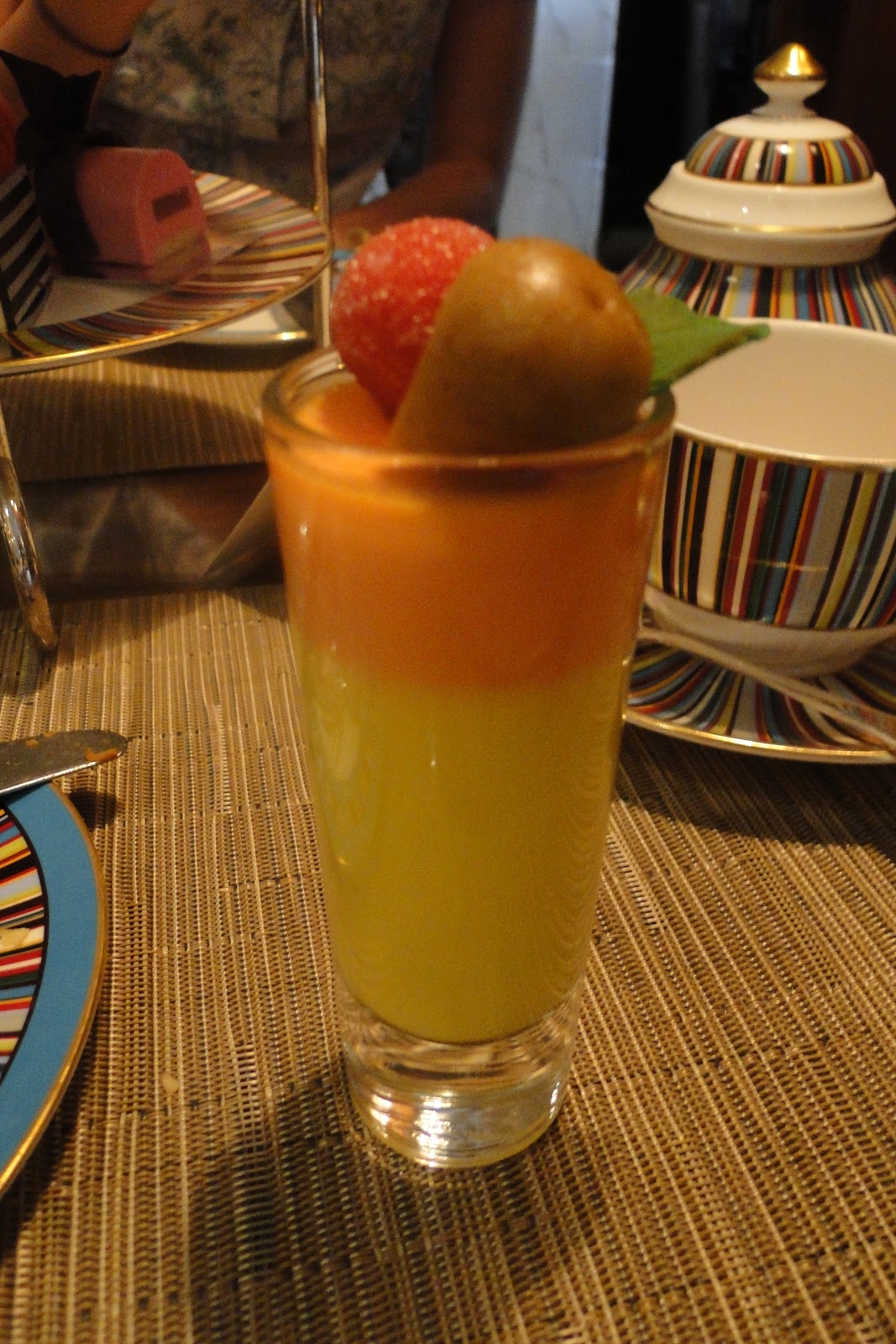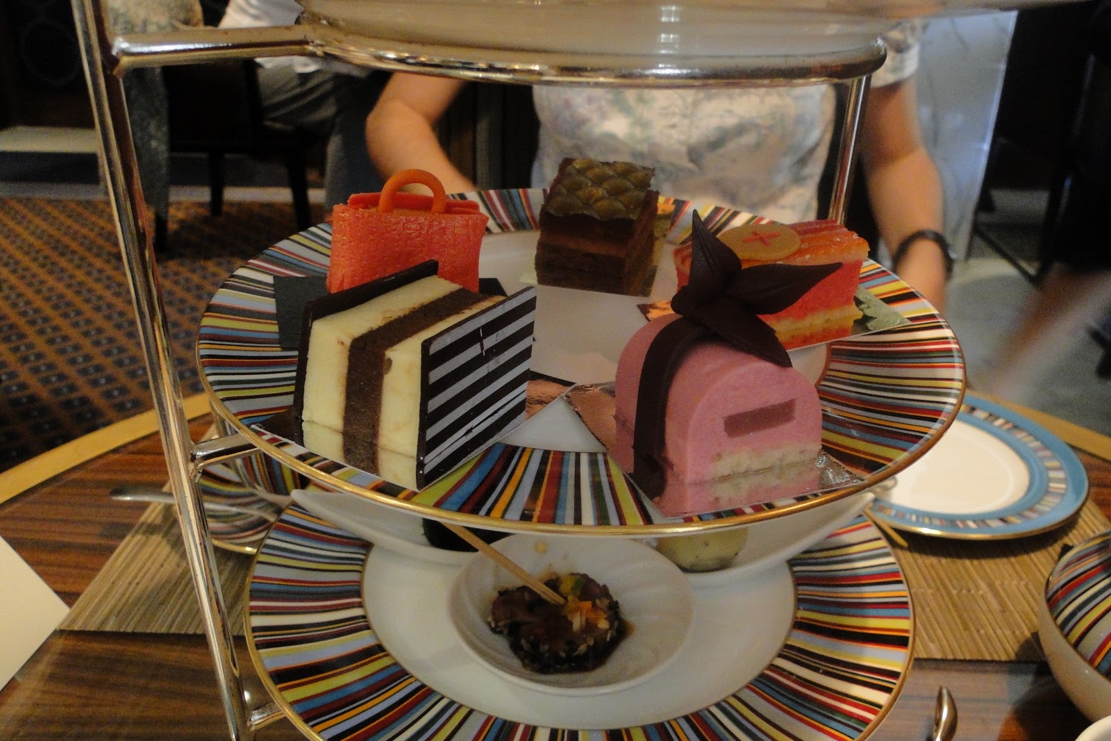 Mas o chá não é formado só pelos doces, primeiro é servido uma seleção dos tradicionais finger sandwiches ingleses, pepino com cream cheese (o mais surpreendente, parece ser sem graça, mas é delicioso!), salmon defumado com cream cheese, ovo com maionese, pasta de vegetais e um wrap de frango e legumes – esse último, nada tradicional, mas muito bom. No andar de baixo da bandeja, no lugar dos tracionais scones (uma espécie de bolinho que vem acompanhado de creme e geleia de morango), são servidos canapés salgados – para mim, que não sou muito fã de doces, é a melhor parte – as receitas são bem diferentes, por isso não consigo lembrar, mas normalmente são feitos com ingredientes nobres como king crab e kobe beef.