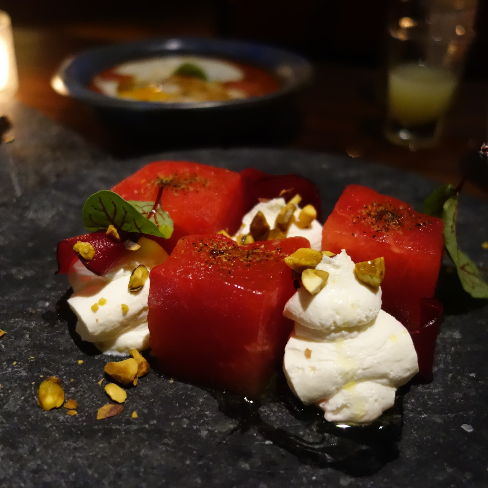 A Watermellon Salad, salada de melancia com queijo de cabra, picles de beterraba e pistache.