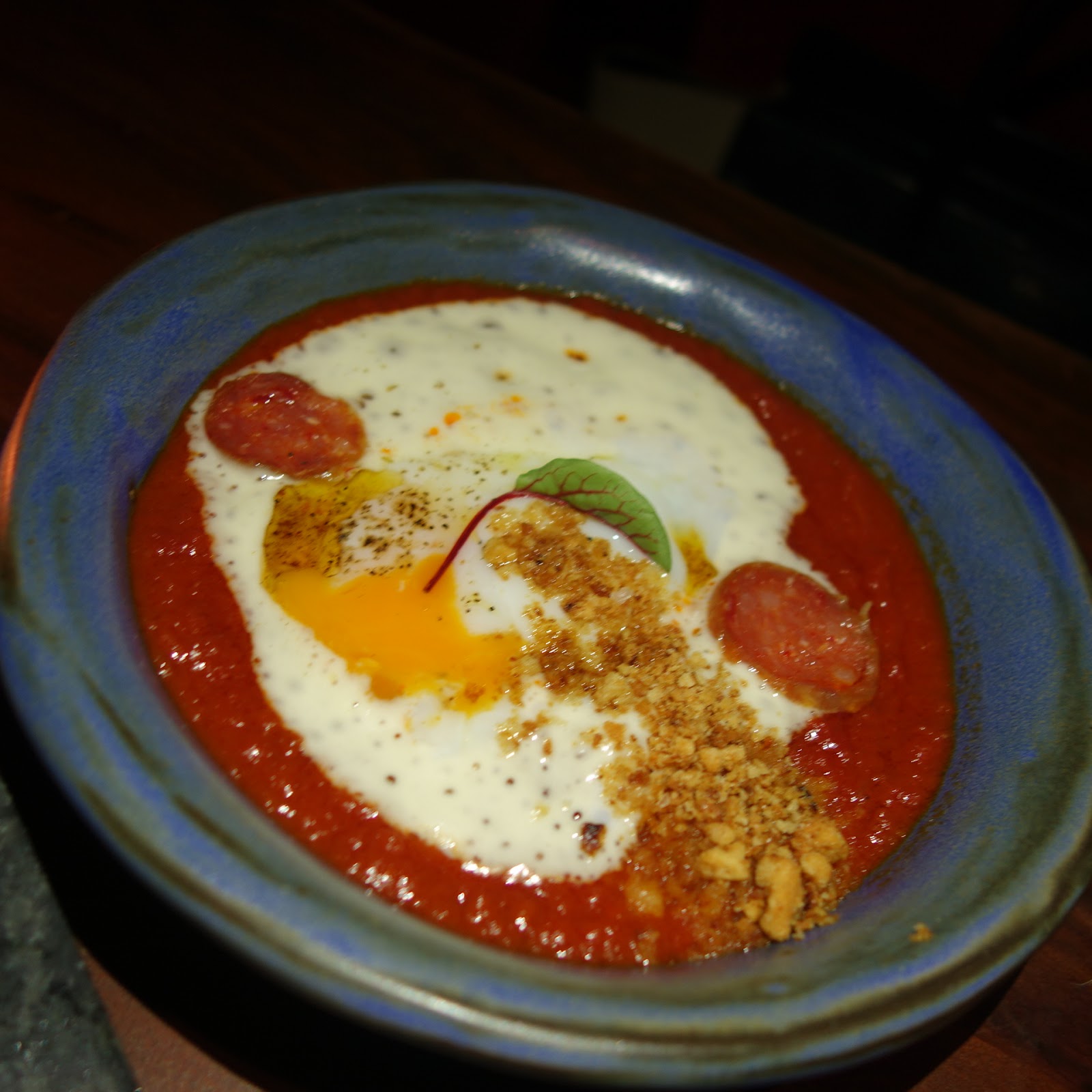 E a entrada que me conquistou, o Uovo in Purgatório, um ovo perfeito sobre um encorpado molho de tomate, linguiça artesanal, farofa de focaccia e espuma de queijo caciocavallo.
