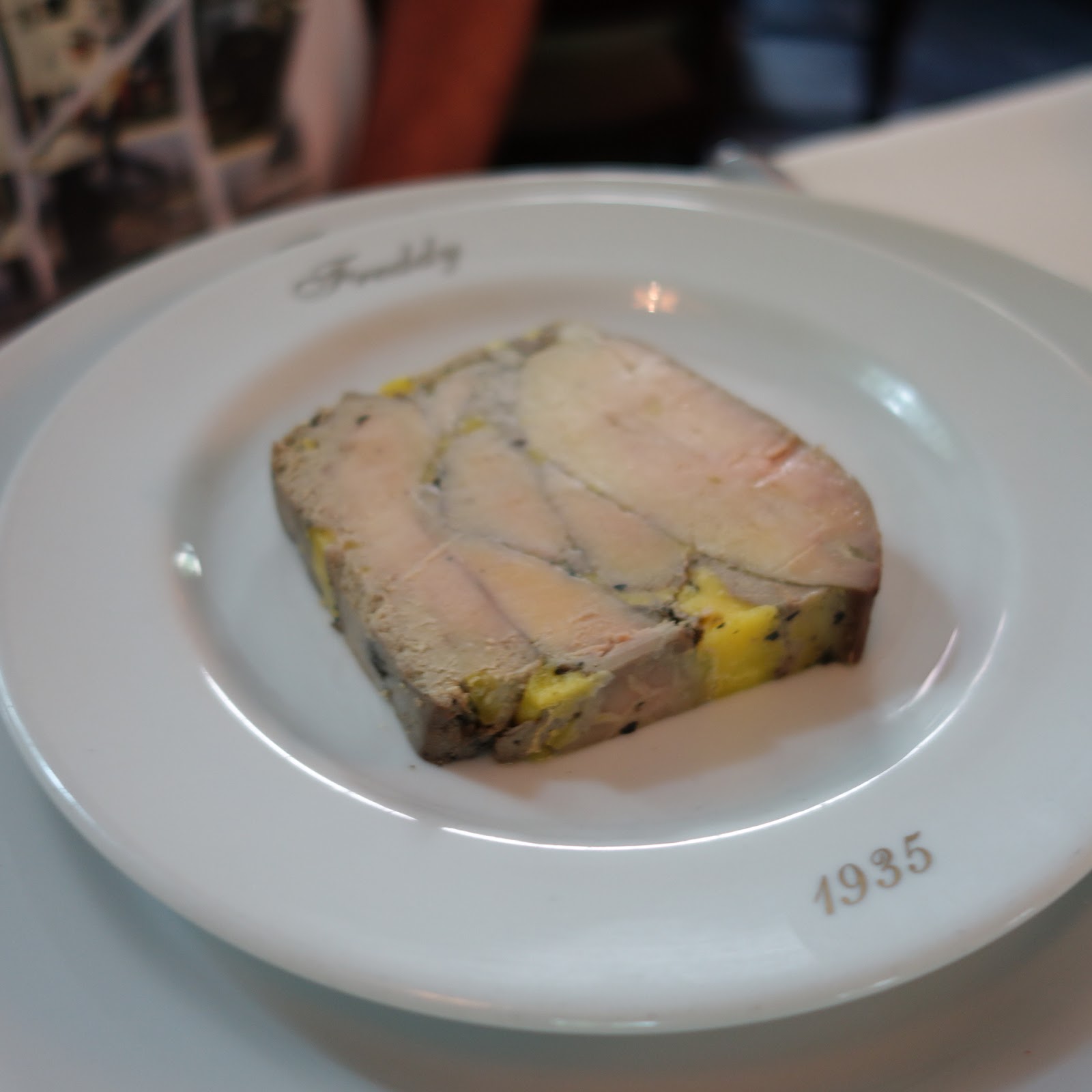 Pedimos também o maravilhoso foie gras en terrine que vem servido em uma generosa porção e acompanhado por torradinhas de pão de forma.