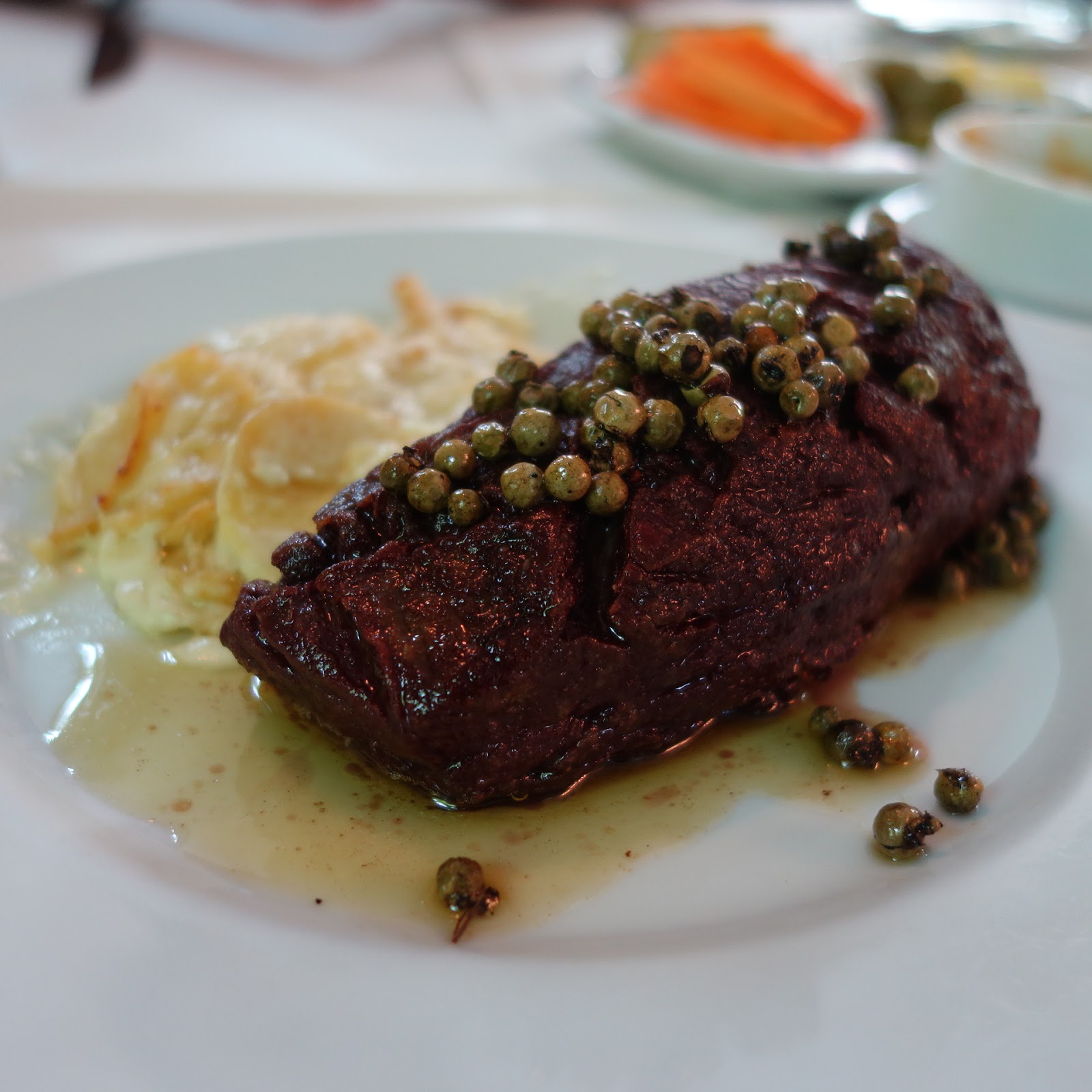 Meu acompanhante foi mais ousado, escolheu o filé de avestruz au poivre, prato que me surpreendeu muito. Já havia provado avestruz há muito tempo atras e não lembrava o quanto a carne é gostosa. Na realidade ela parece bem mais uma carne bovina, é vermelha e bem magra, por isso tem um sabor suave. O corte servido estava maravilhoso, novamente no ponto perfeito.