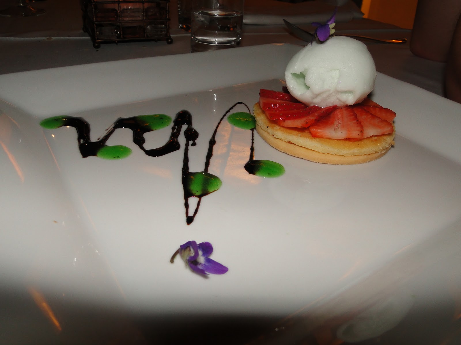 | E por fim, de sobremesa, uma tortinha de morango com sorvete de manjericão. |
