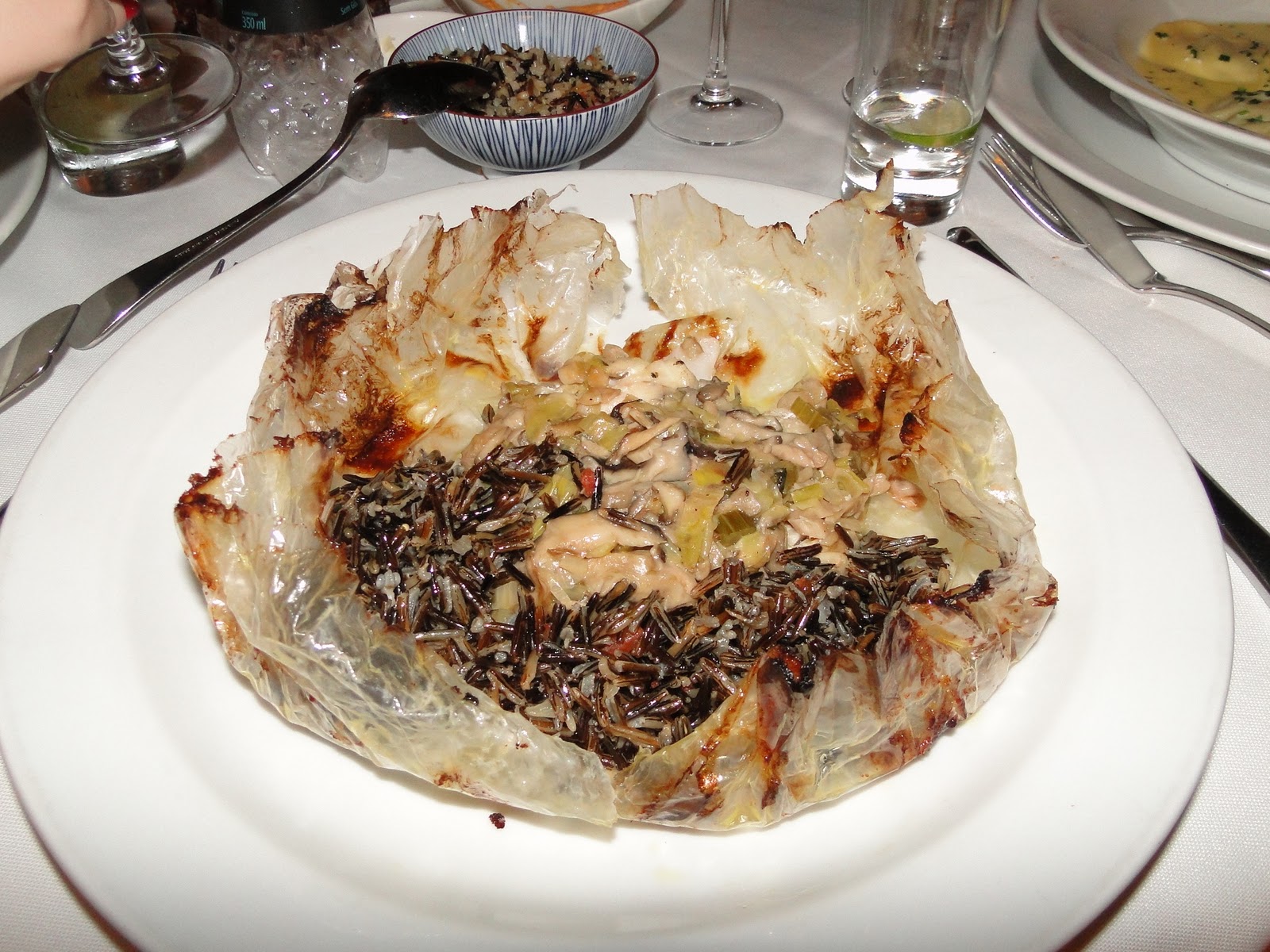 | Papillote de Bacalhau Chackras com mix de cogumelos, salsão e alho poró, acompanhado de arroz selvagem. |