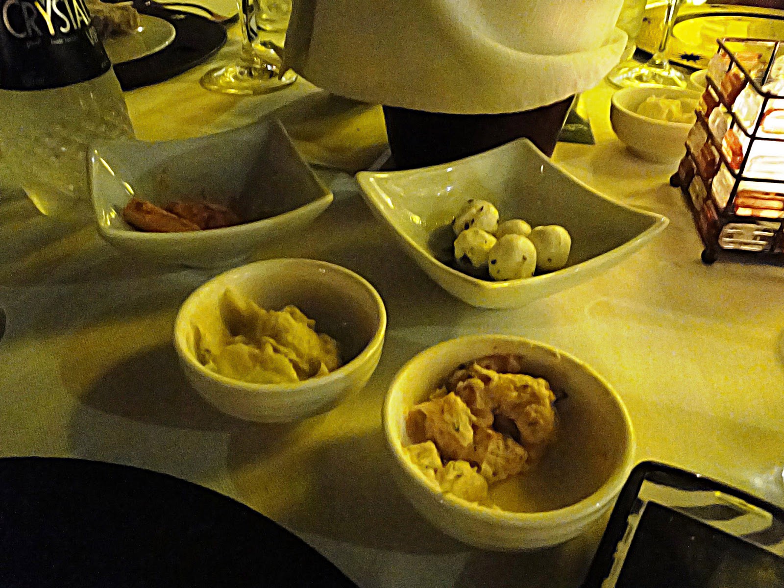 | Os patês: salmão defumado, queijo de cabra, alcachofra (delicioso!) e tomate seco. |