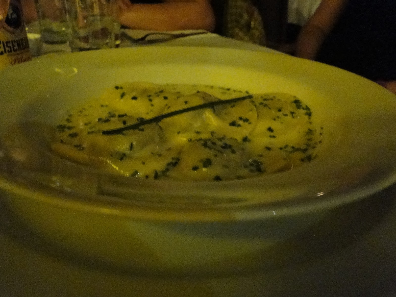 | Ravioloni recheado de vitela e cogumelos com molho de queijo Appenzeller. |