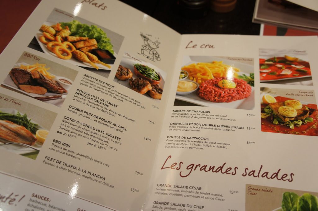 Eles são especializados numa raça de gado francês chamado charolais e servem diversos cortes de carne, aliás, o cardápio é totalmente dedicado a elas, alem de algumas entradas diversas é só o que você vai encontrar. No cardápio existem vários menus de todas as faixas de preço, partindo de 11 euros ou você pode optar pelo o menu a la carte, em ambos os pratos de carne são servidos com acompanhamentos e molhos à vontade.