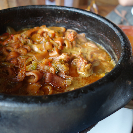 Recomendo muito a Caldeirada com posta de peixe, lula, camarão e polvo ensopados em um molho a base de tomate servida com arroz branco e pirão.