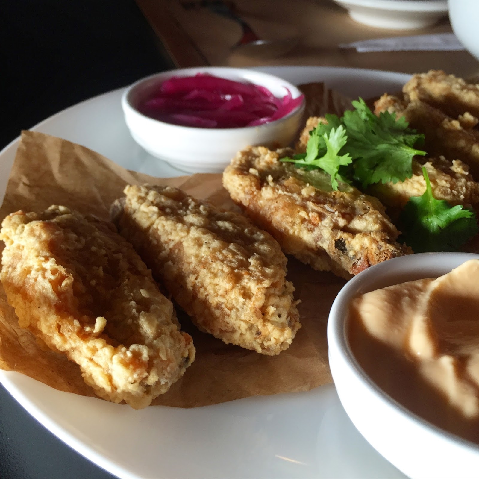 Aos sábados, as tulipas de frango empanadas com maionese de sriracha são uma ótima pedida, totalmente viciantes.