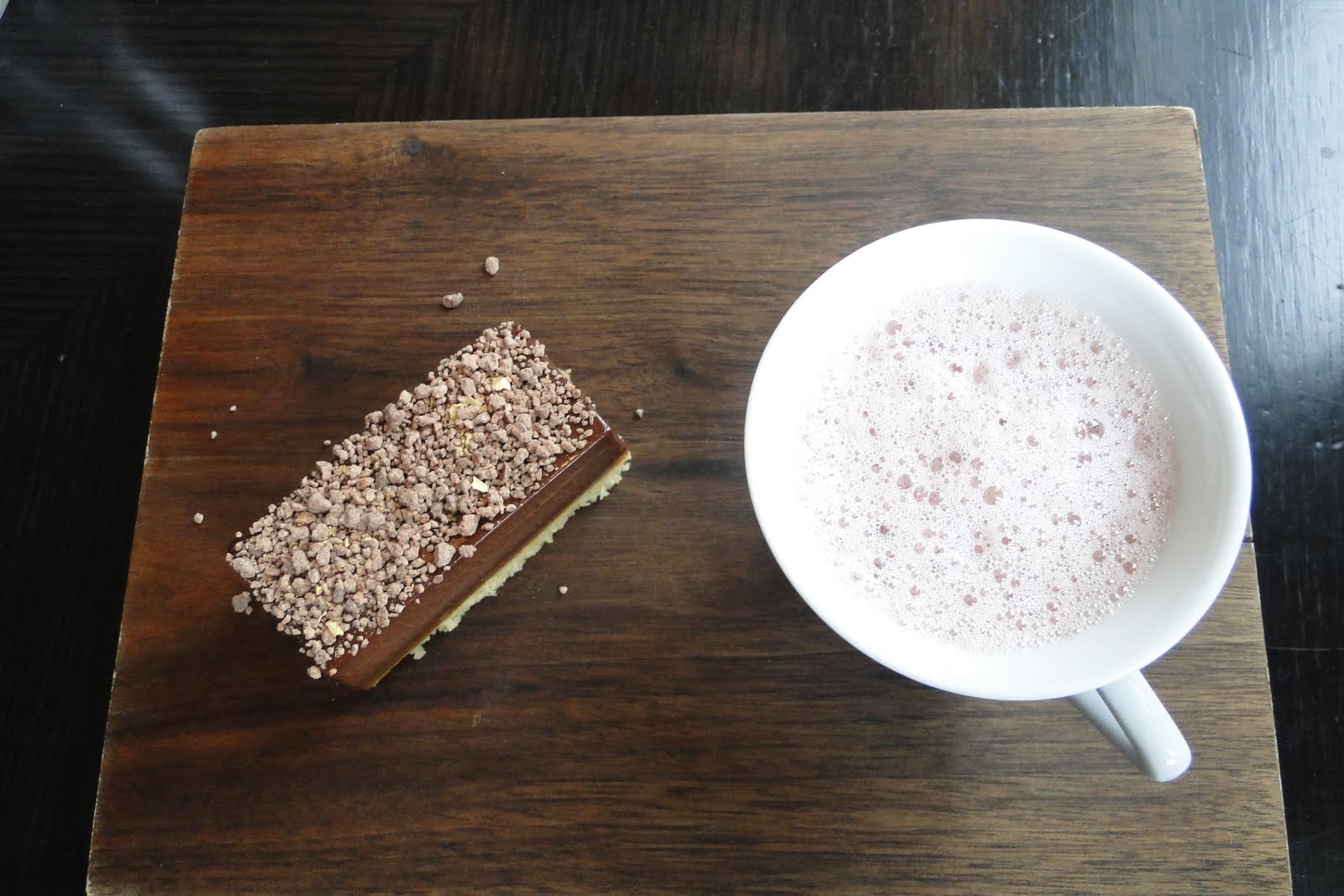 A minha sobremesa era um espécie de rabanada recheada de doce de leite e caramelizada acompanhada de sorbet de framboesa e farofa de chocolate branco, muito bom, mas extremamente doce. Mas legal mesmo foi a sobremesa da minha irmã, Millonaire Tart (desculpem pela péssima foto!), uma torta em camadas com shortbread, toffee e chocolate, acompanhada de chocolate quente de vinho. Gente não consigo nem explicar essa bebida, é chocolate quente e também é vinho!! Surpreendente!