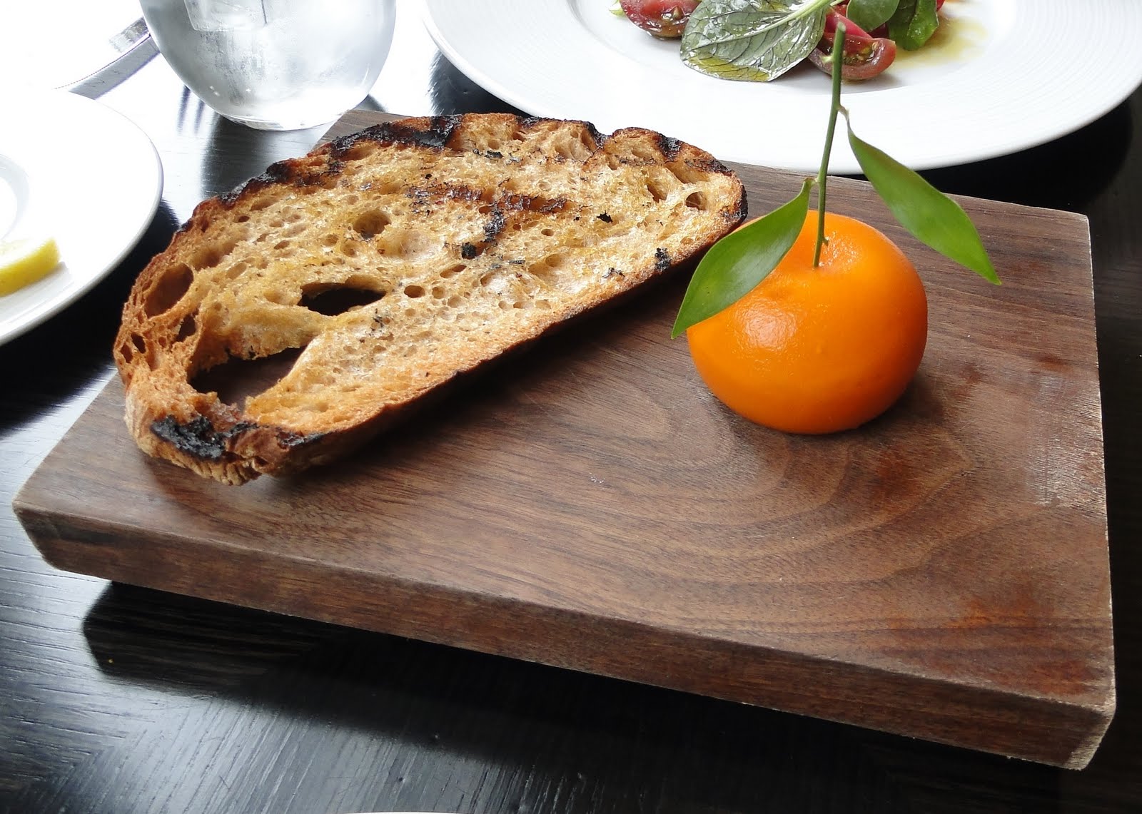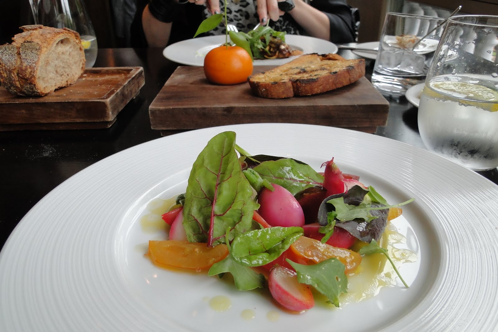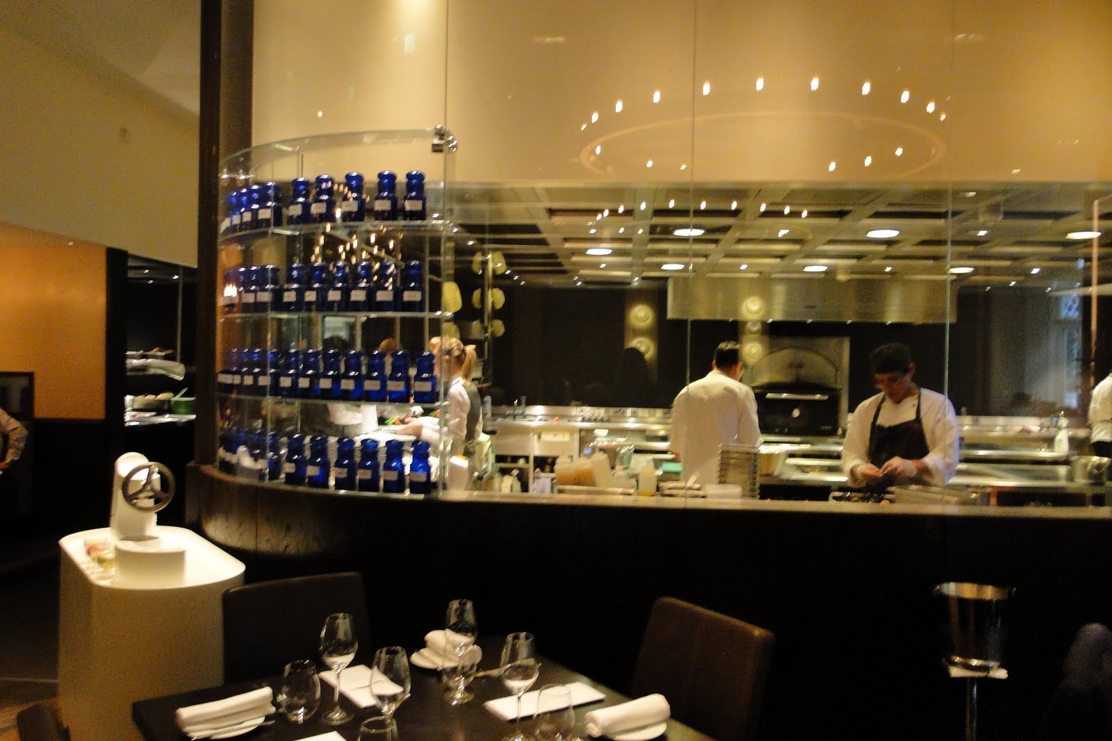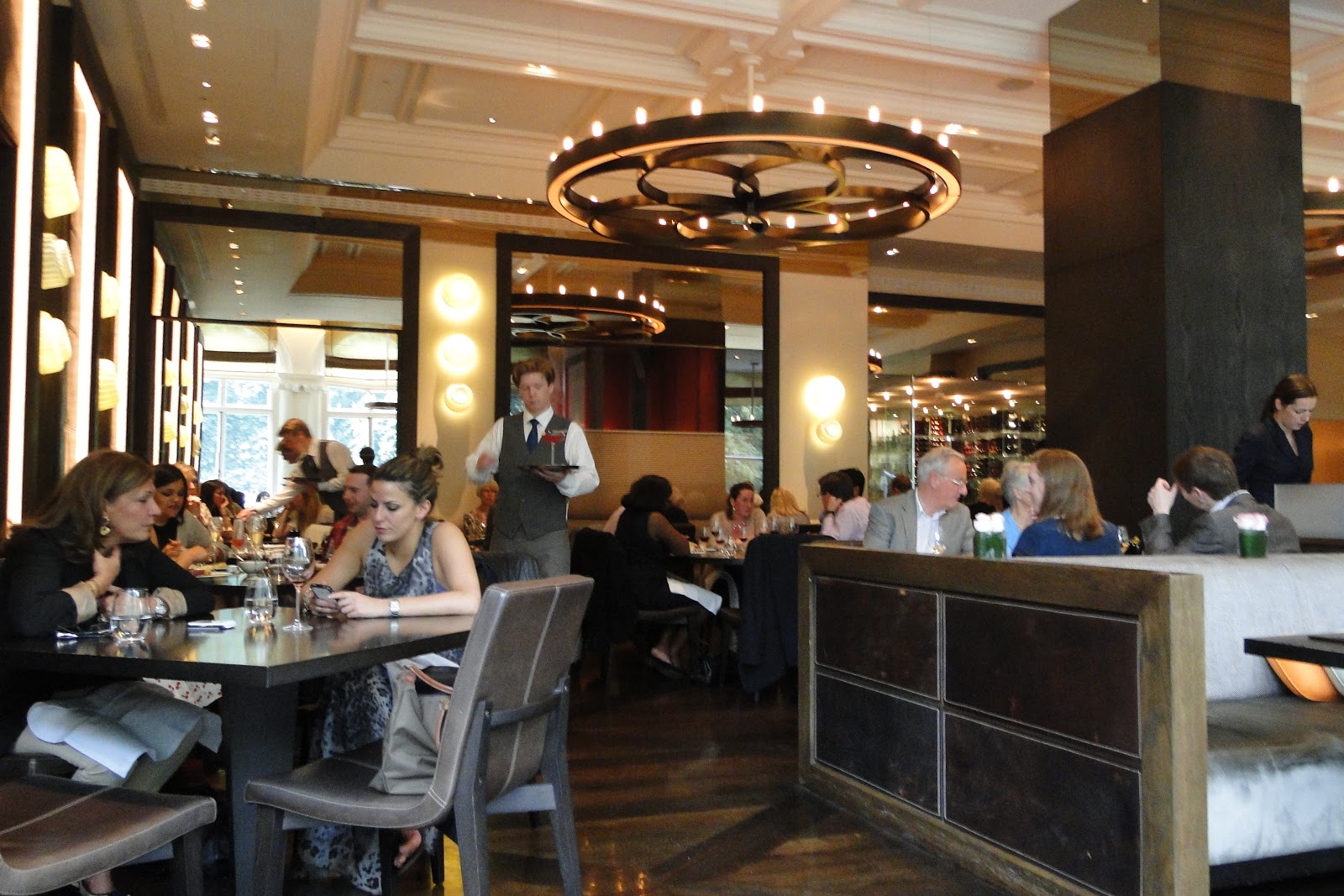 A decoração, descrita no site como contemporânea e inovadora, com algumas referências antigas, não surpreende, é bem típica de um restaurante de hotel, móveis sóbrios, madeira escura, materiais como o couro, a única peça retro encontrada são as luminárias feitas com formas de gelatina dos anos 50. A enorme janela de vidro que da para a cozinha, também chama a atenção, mas é ofuscada pelas outras janelas, que dão vista ao Hyde Park, a verdadeira estrela do ambiente. Não pude deixar de reparar também. que os móveis já estavam bem “gastos”, paredes raladas, sofás encardidos, estranho para um restaurante tão novo, talvez sejam consequências de abrir um estabelecimento com lotação fechada por um ano praticamente. Felizmente, o detalhe não foi percebido só por mim, recentemente, o Dinner anunciou que vai ficar fechado por um mês para manutenção.