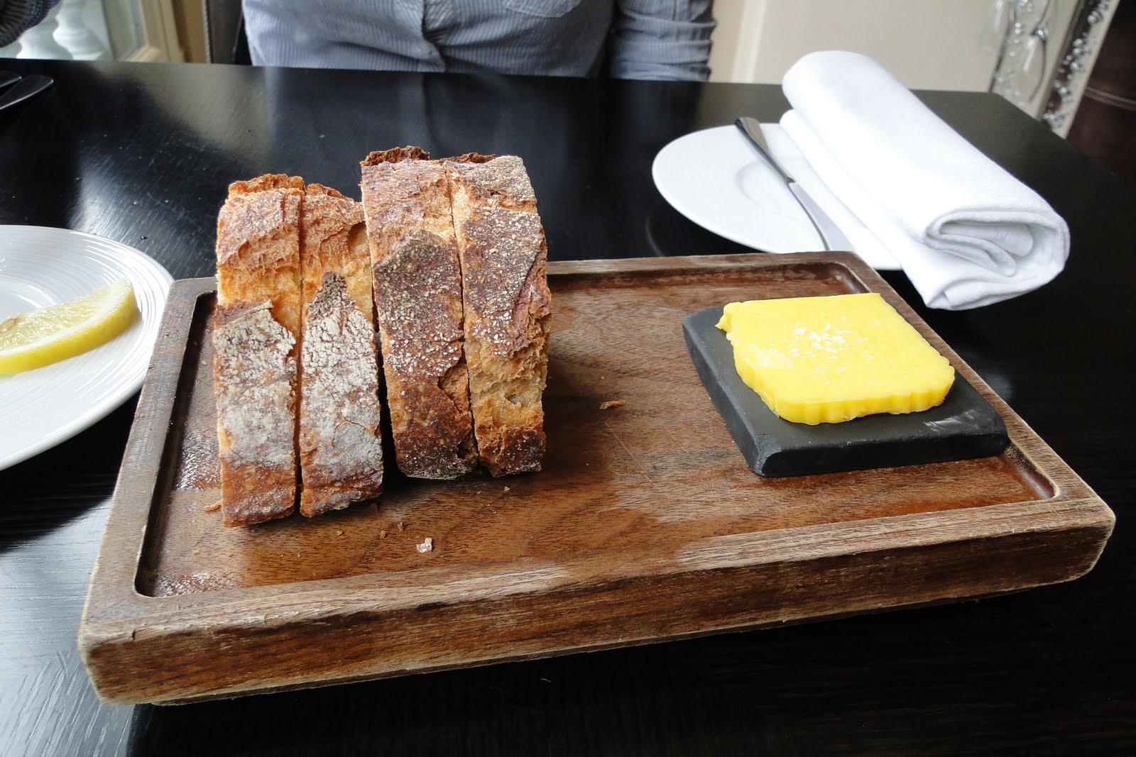 | O couvert: pães da casa e manteiga artesanal com flor de sal. Ao contrário dos restaurantes brasileiros, lá o couvert não é cobrado e é reposto todas as vezes que acaba sem custo adicional. |