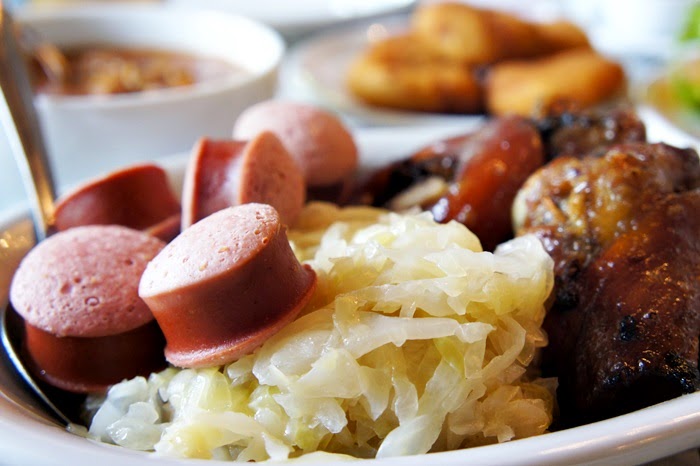 E então chegam os principais: Bolinhos de Aipim, Lombo à Milanesa “Schnitzel”, Frango ao Forno com Maçãs, Nhoque recheado com Queijo e Bacon “Knödel” ,Carré Suíno Defumado “Kassler” , Repolho Roxo Agridoce “Rotkohl”, Chucrute “Sauerkraut”, Salsicha Bock “Bockwurst”, Joelho de Porco “Eisbein”, Almôndegas ao Forno “Frikadellen”, Matambre Enrolado “Rinderrouladen”, Massa Caseira, Molho com Moelas de Frango, Panqueca de Maçã “Apfelpfannkuchen”, Purê de Batatas e Arroz.