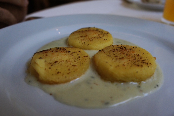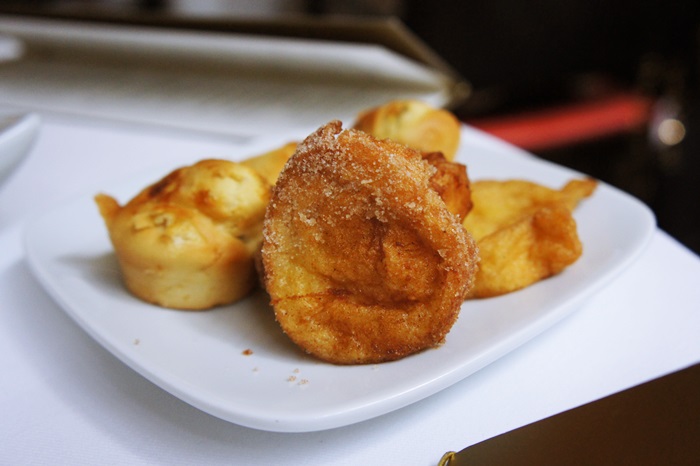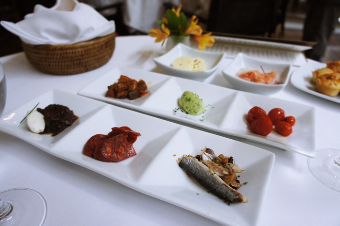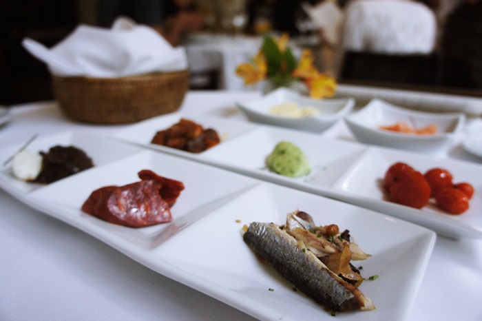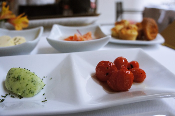 Logo ao sentar o enorme couvert formado por muffins de gorgonzola e damasco, mini rabanadas, caponata de legumes orgânicos, queijo Feta, tomates cereja assados em azeite, chouriço serrano, boursin com compota de cebola ao vinho tinto, ceviche de salmão marinado em água de coco, sardinhas com cebolas e uvas passas, bowl de folhas verdes e quentinhos pães artesanais de linhaça com suco de maçã, pistache e castanha do pará vem a mesa. Chegam também a mesa as taças de espumante – que não ficam um segundo vazias – e você é perguntado sobre a sua preferencia de bebidas não alcoólicas, estão disponíveis inúmeras opções de sucos naturais, água com e sem gás e se eu não me engano, refrigerante. Minha primeira opção foi uma limonada suíça que estava perfeita.
